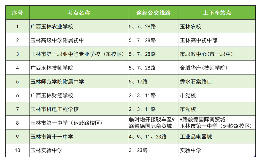 玉林市第一中學(xué)(運(yùn)嶺路校區(qū))考點(diǎn)目前沒有公交線路途經(jīng),為方便考生參加考試,玉林公交公司在3月16日增設(shè)臨時(shí)接駁線一條。