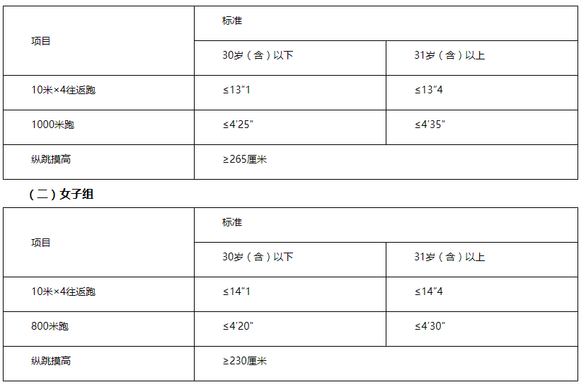 體能測評三項全部達標方為合格。體能測評項目中,縱跳摸高的測試次數不超過3次,10米×4往返跑的測試次數不超過2次,長跑項目(男子1000米、女子800米)的測試次數為1次。