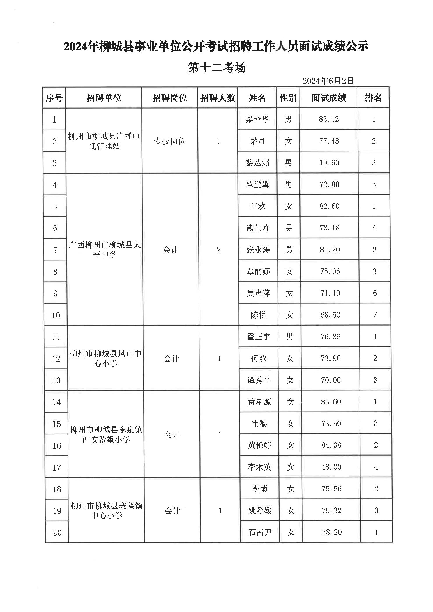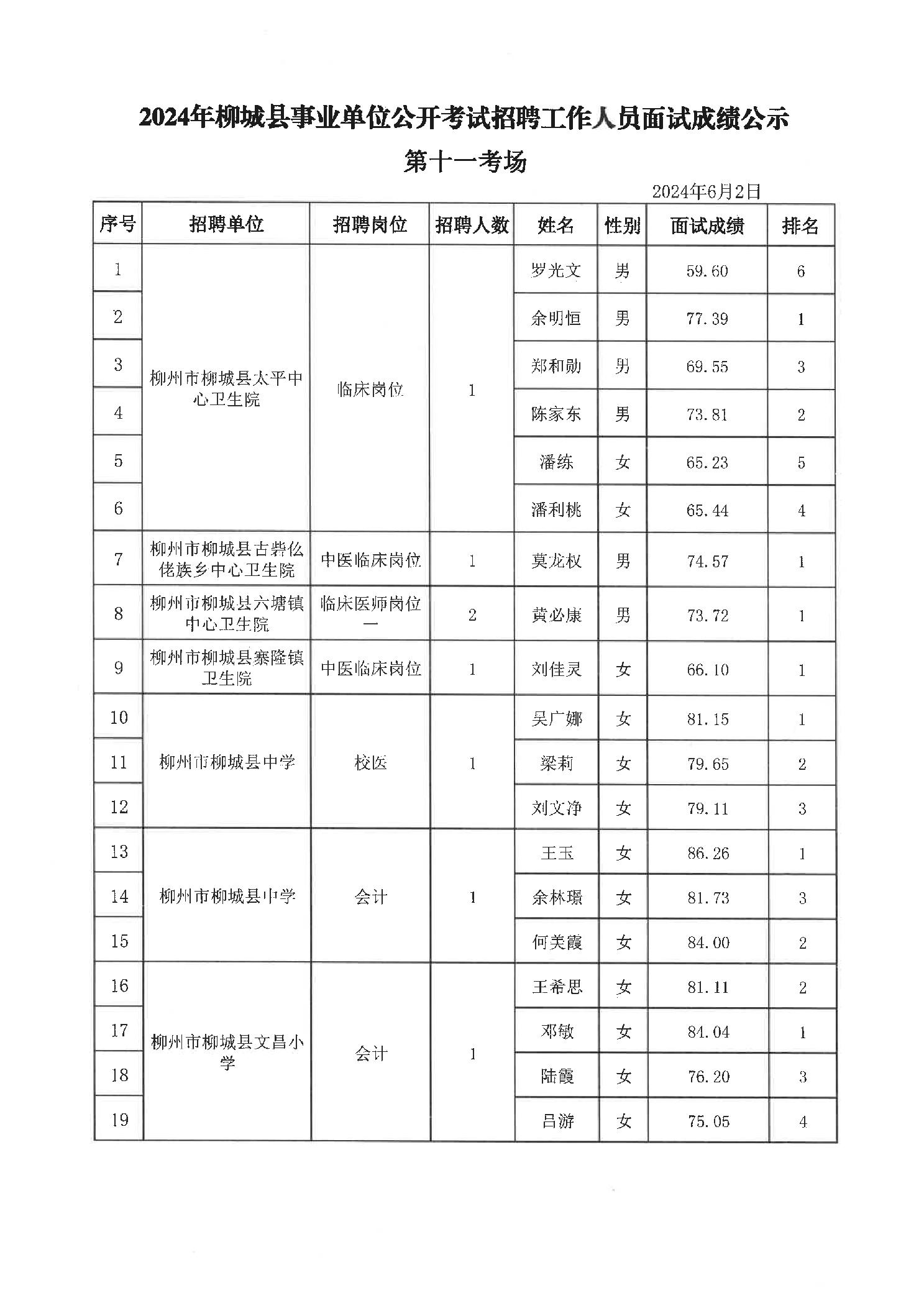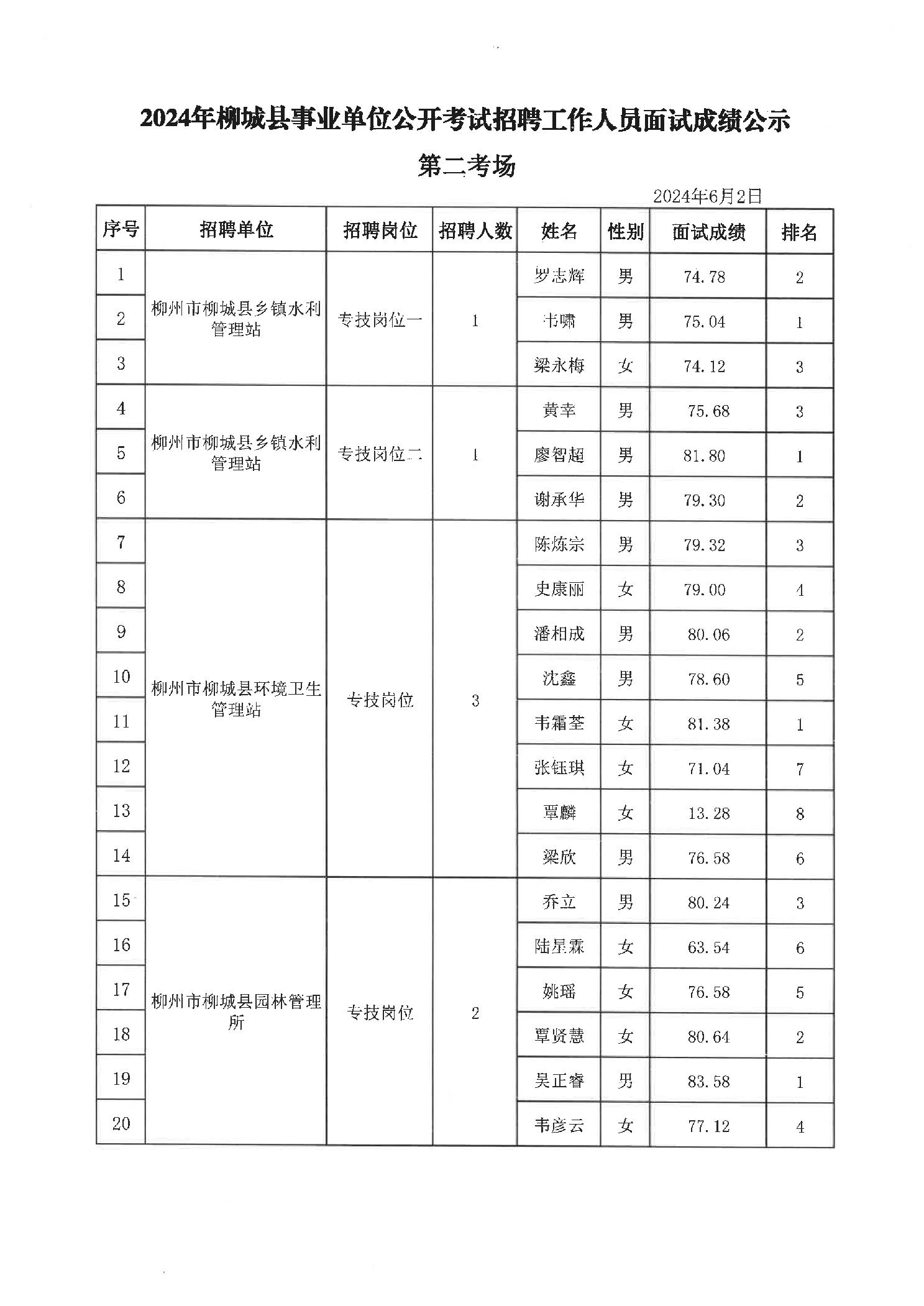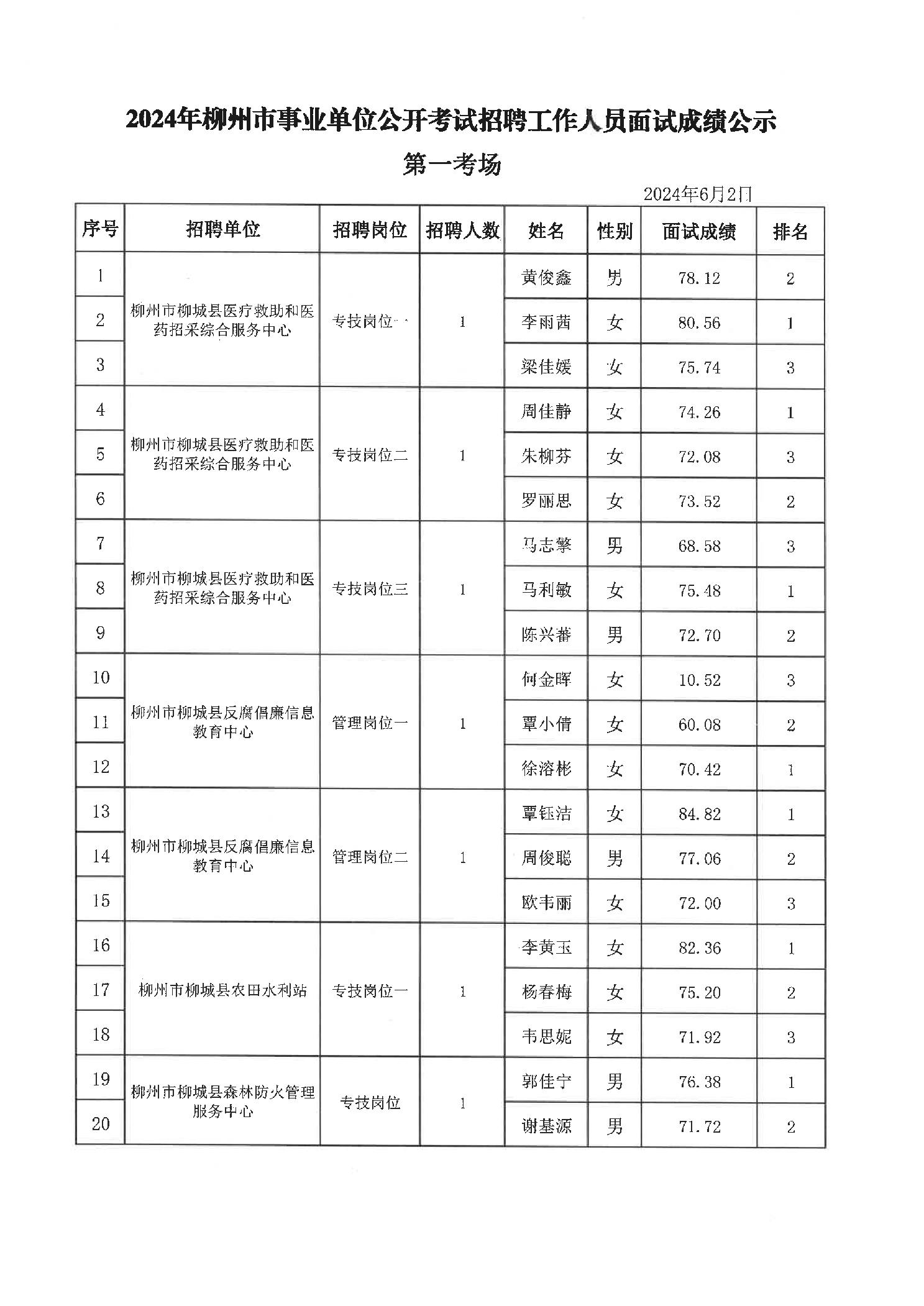 2024年柳城縣事業單位公開考試招聘工作人員面試成績公示