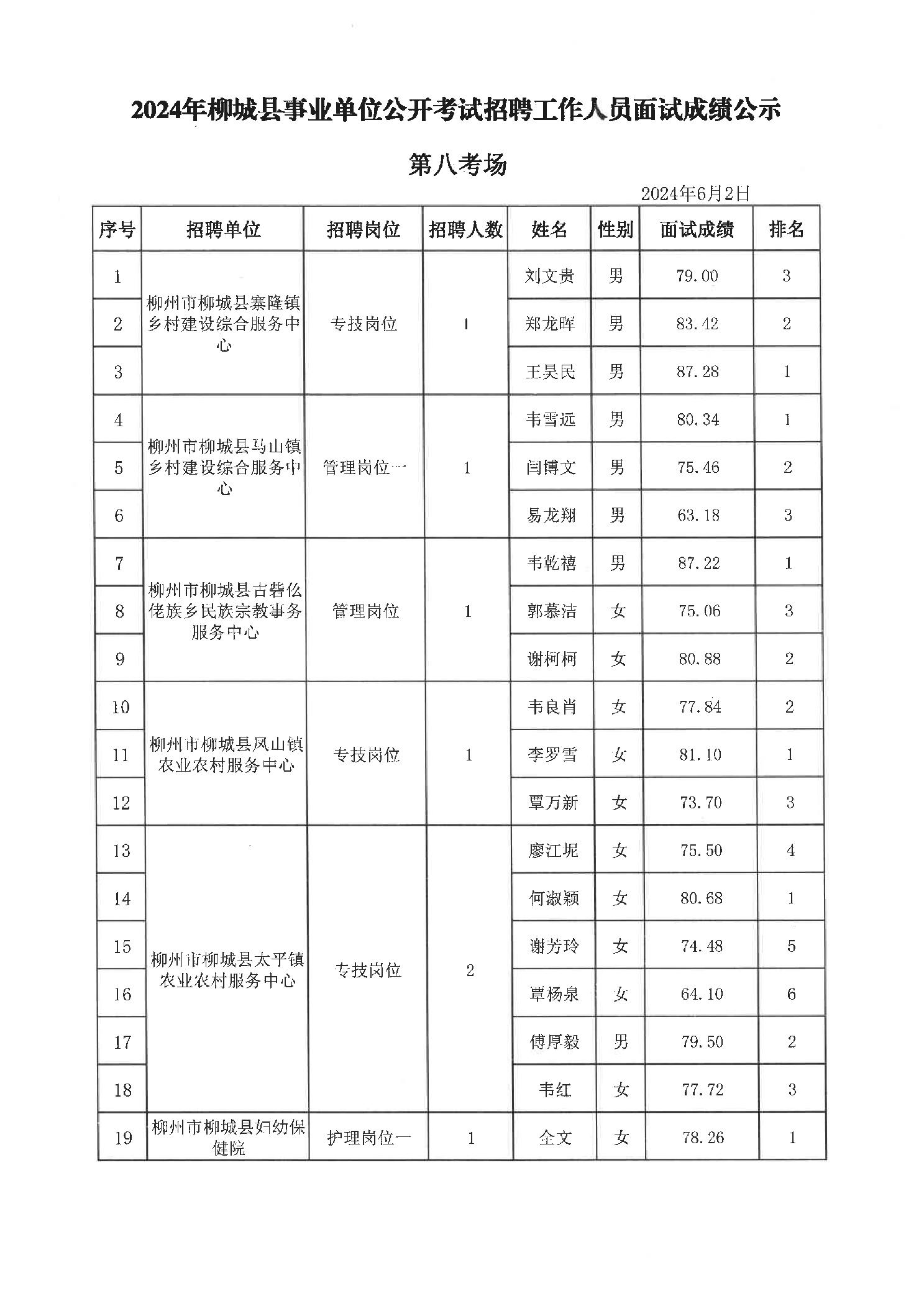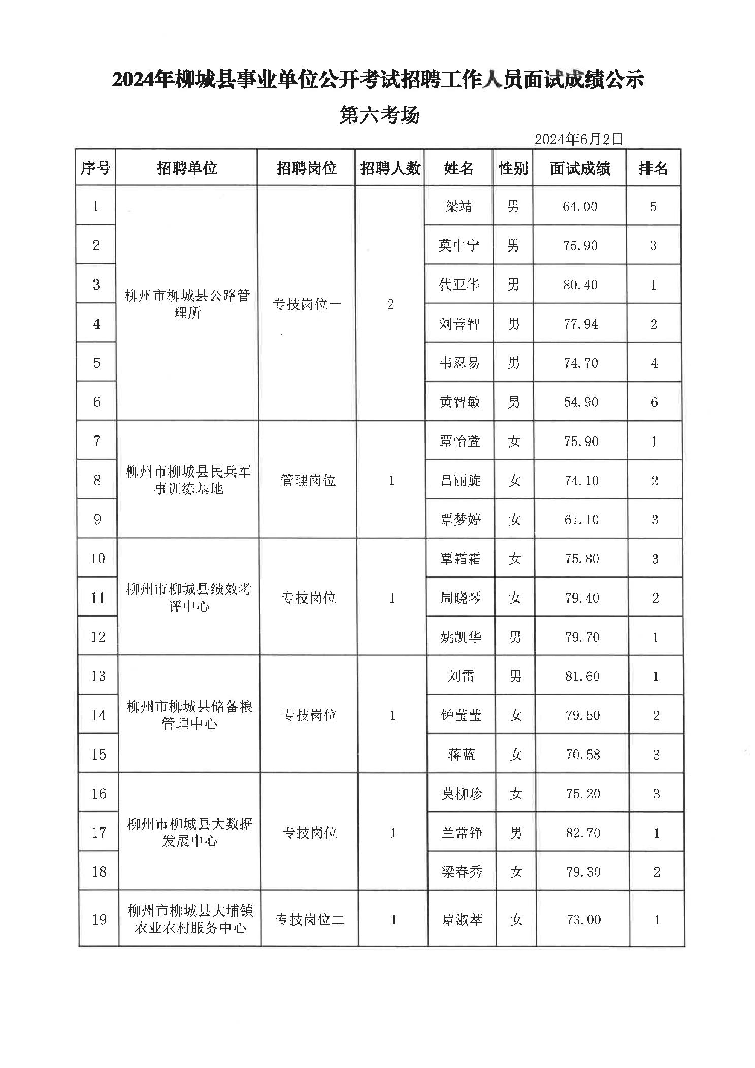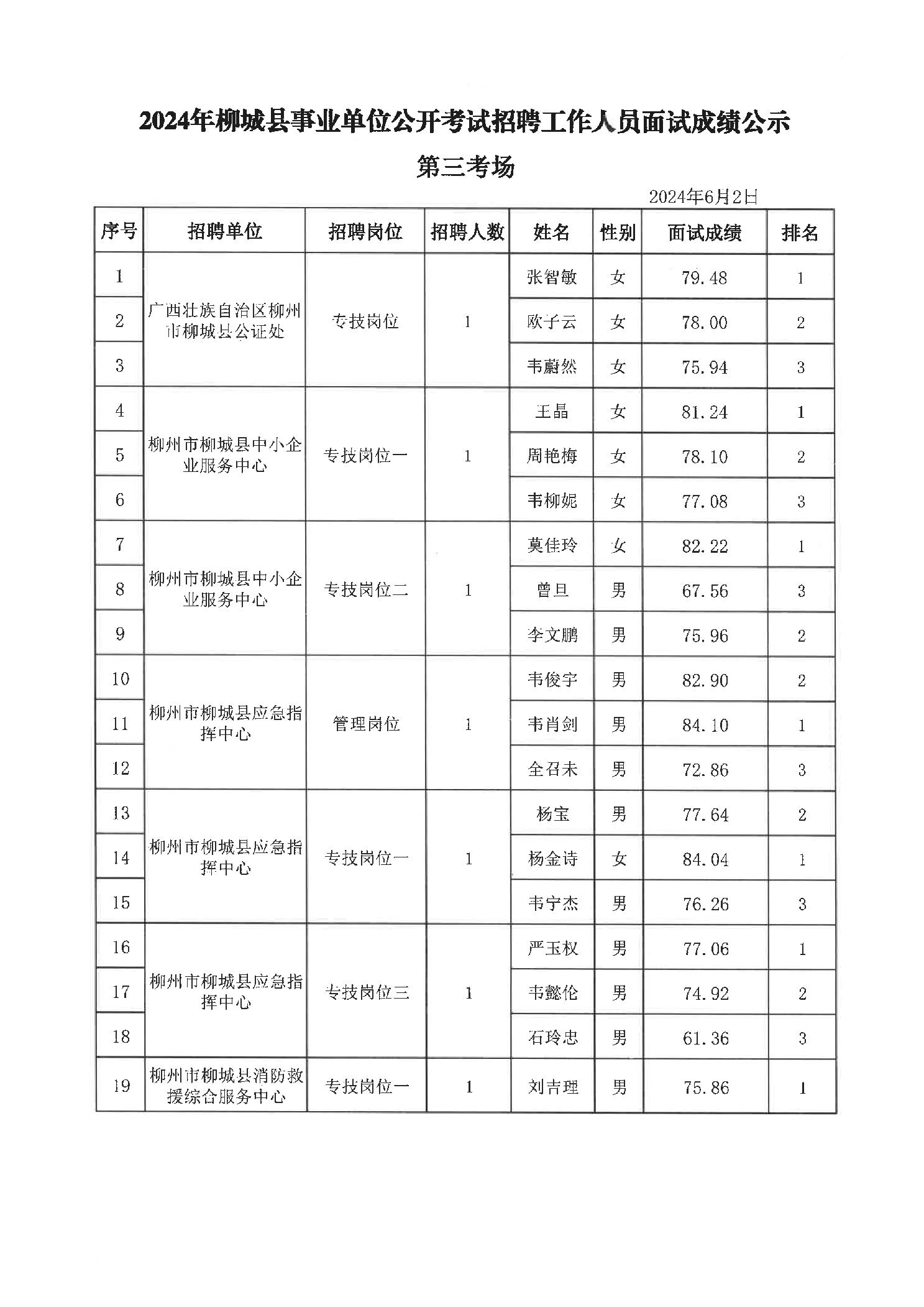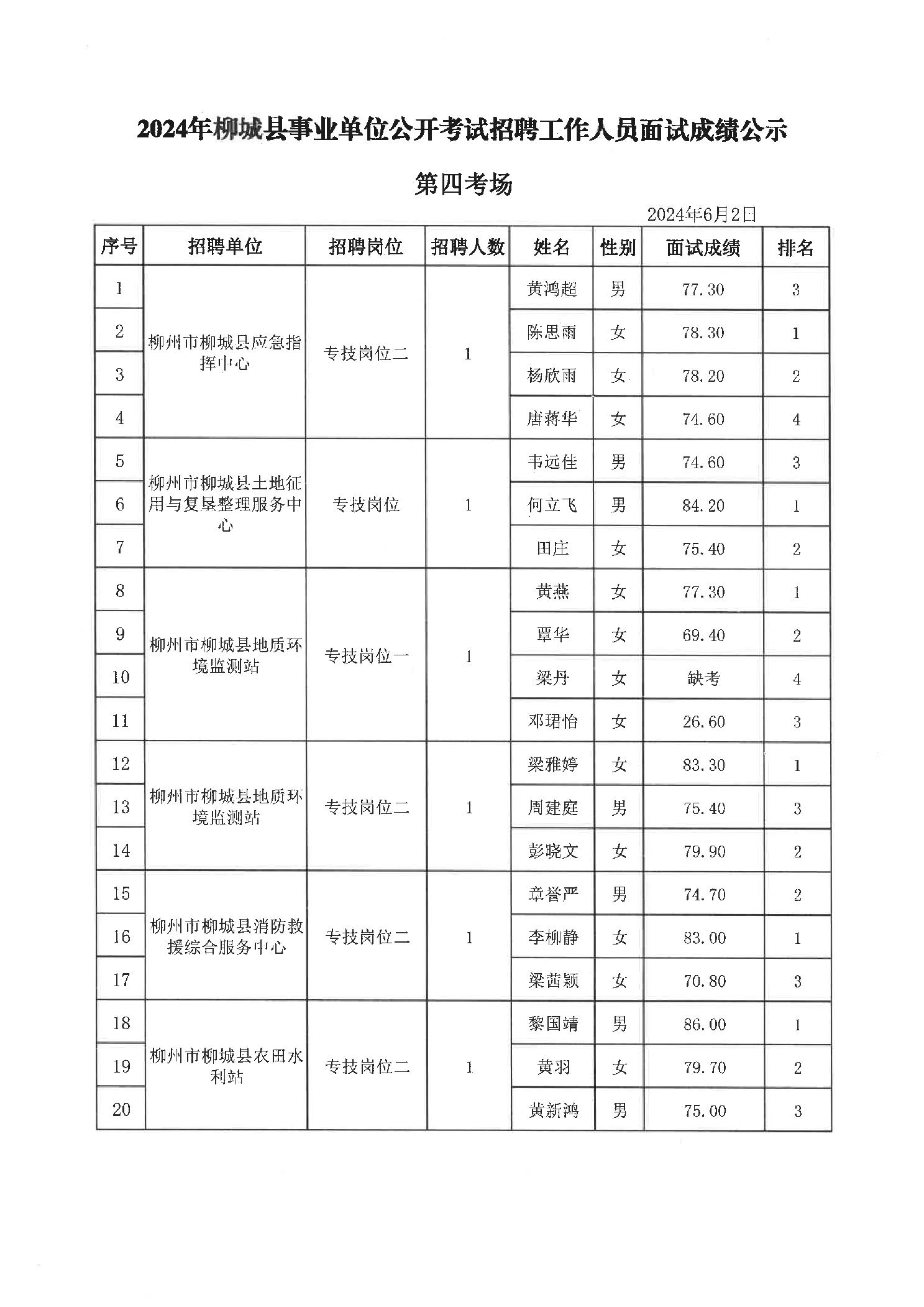 2024年柳城縣事業單位公開考試招聘工作人員面試成績公示