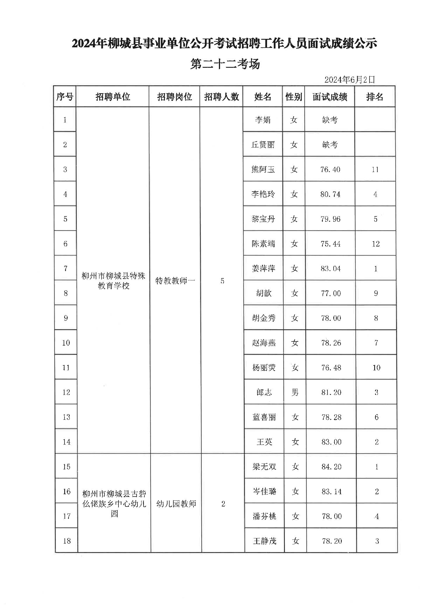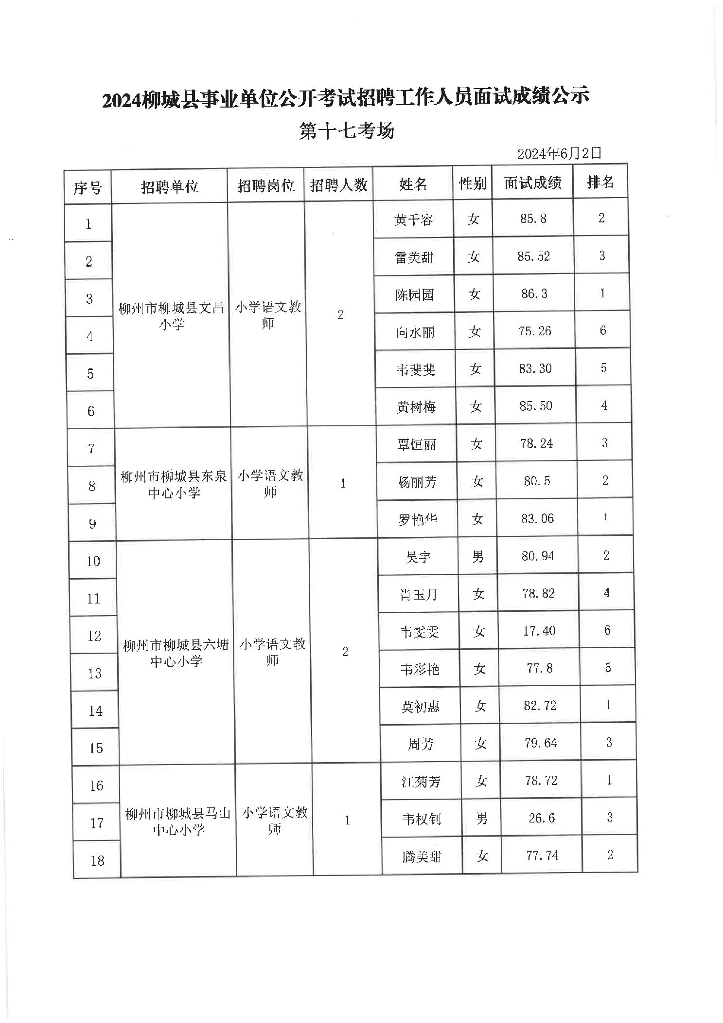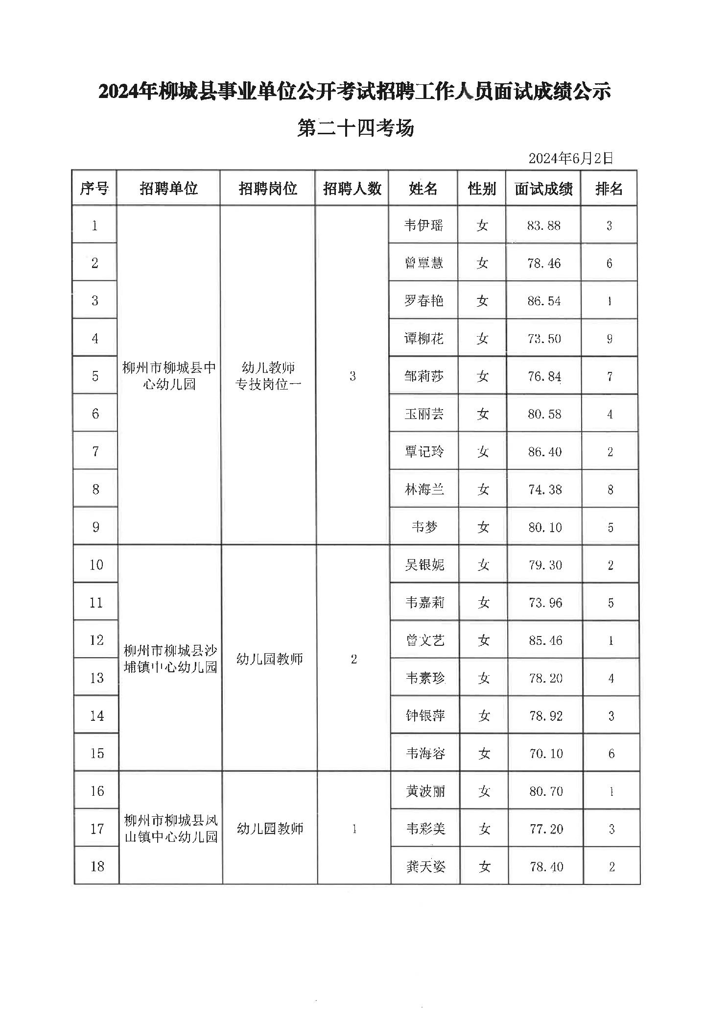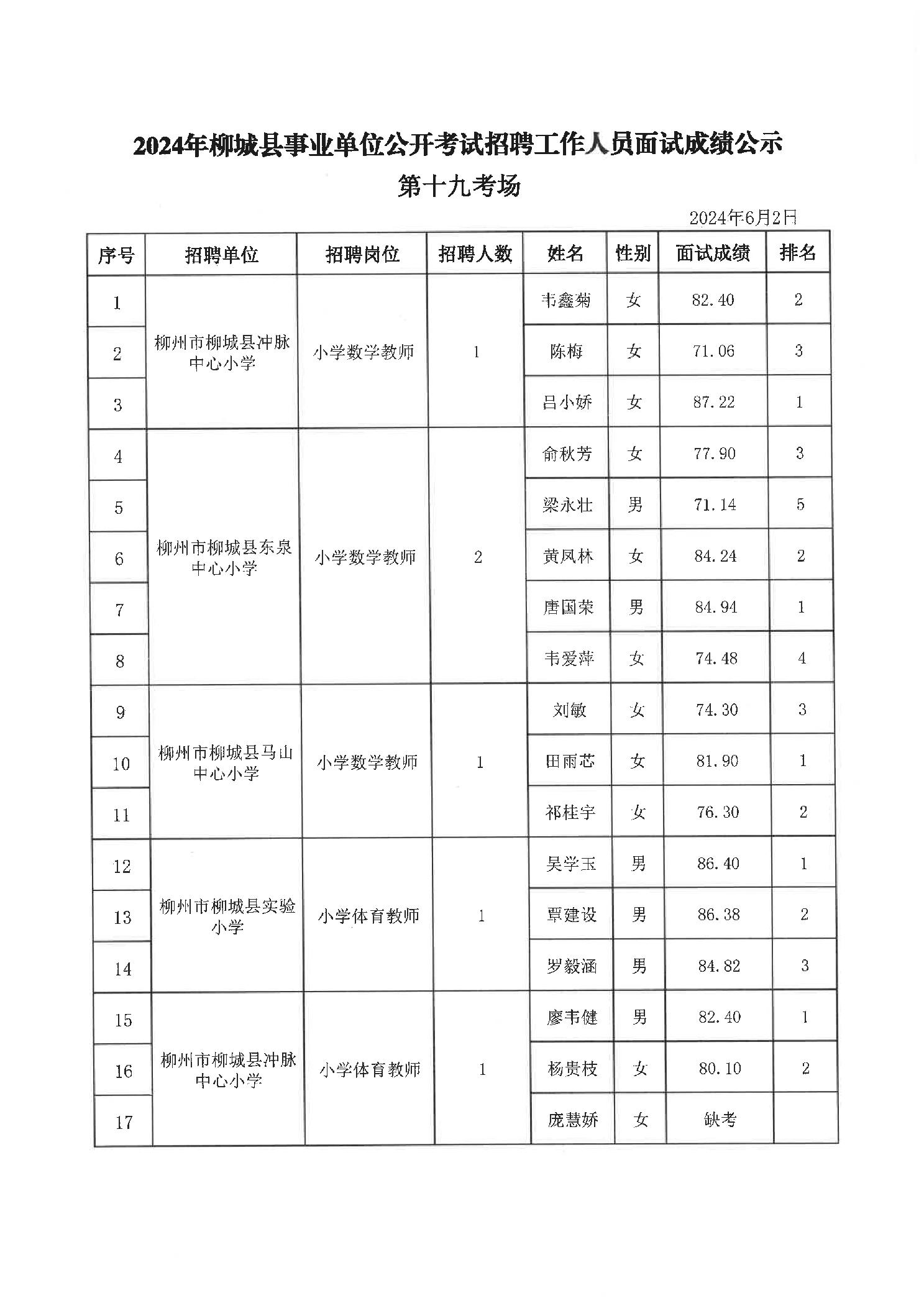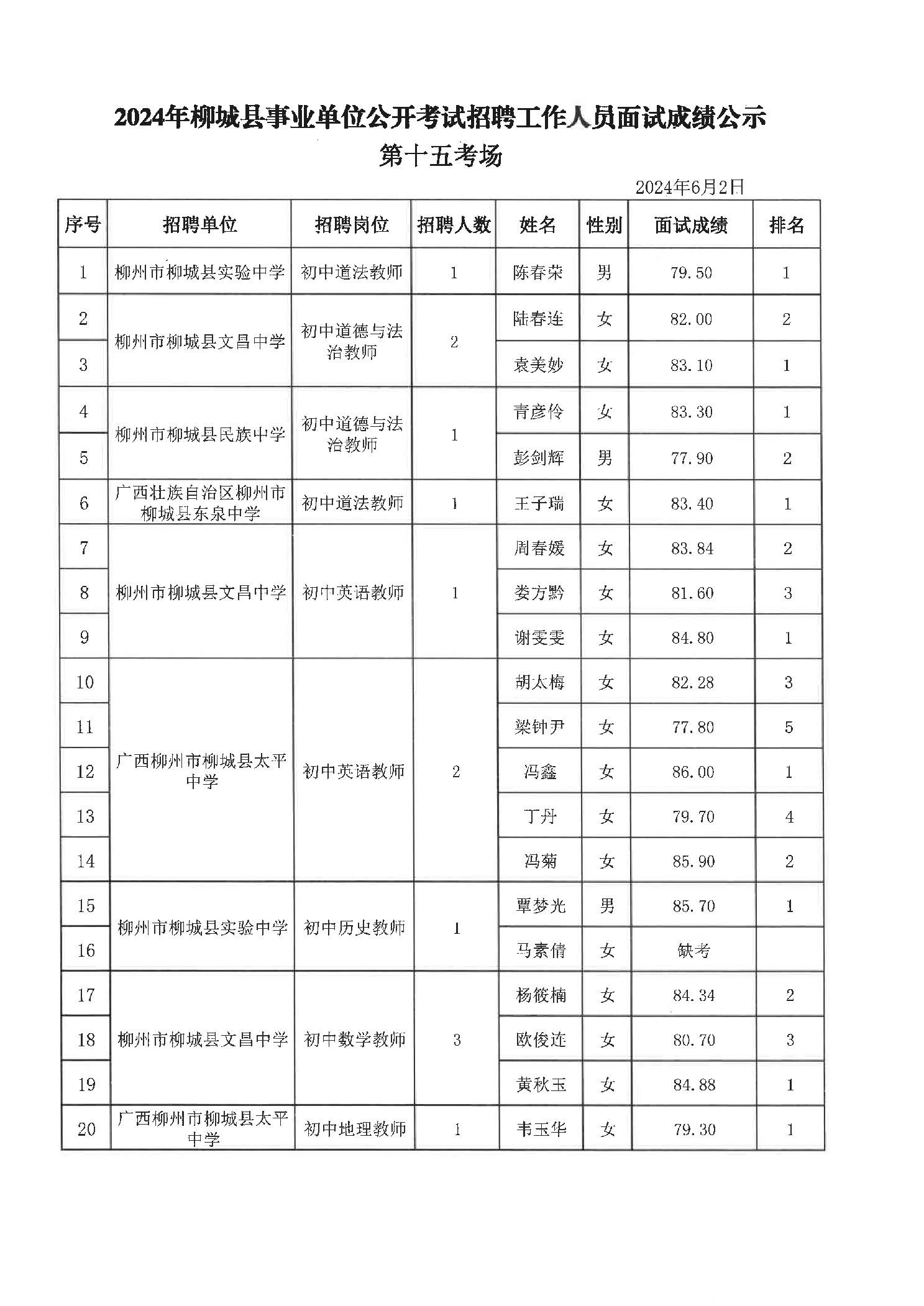 2024年柳城縣事業單位公開考試招聘工作人員面試成績公示