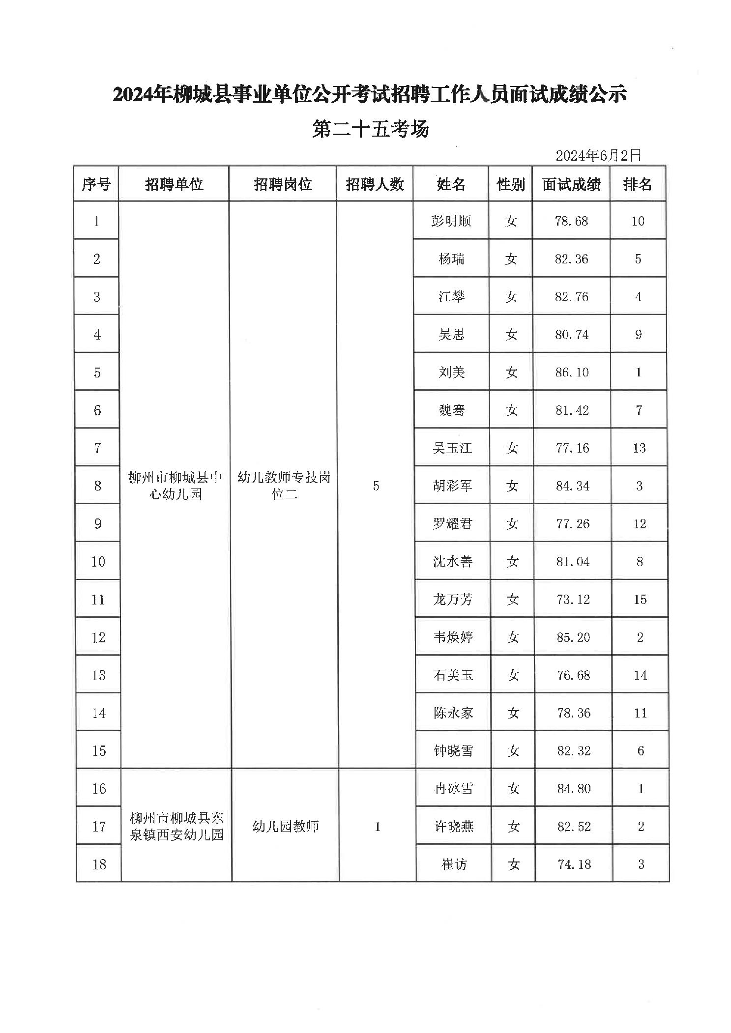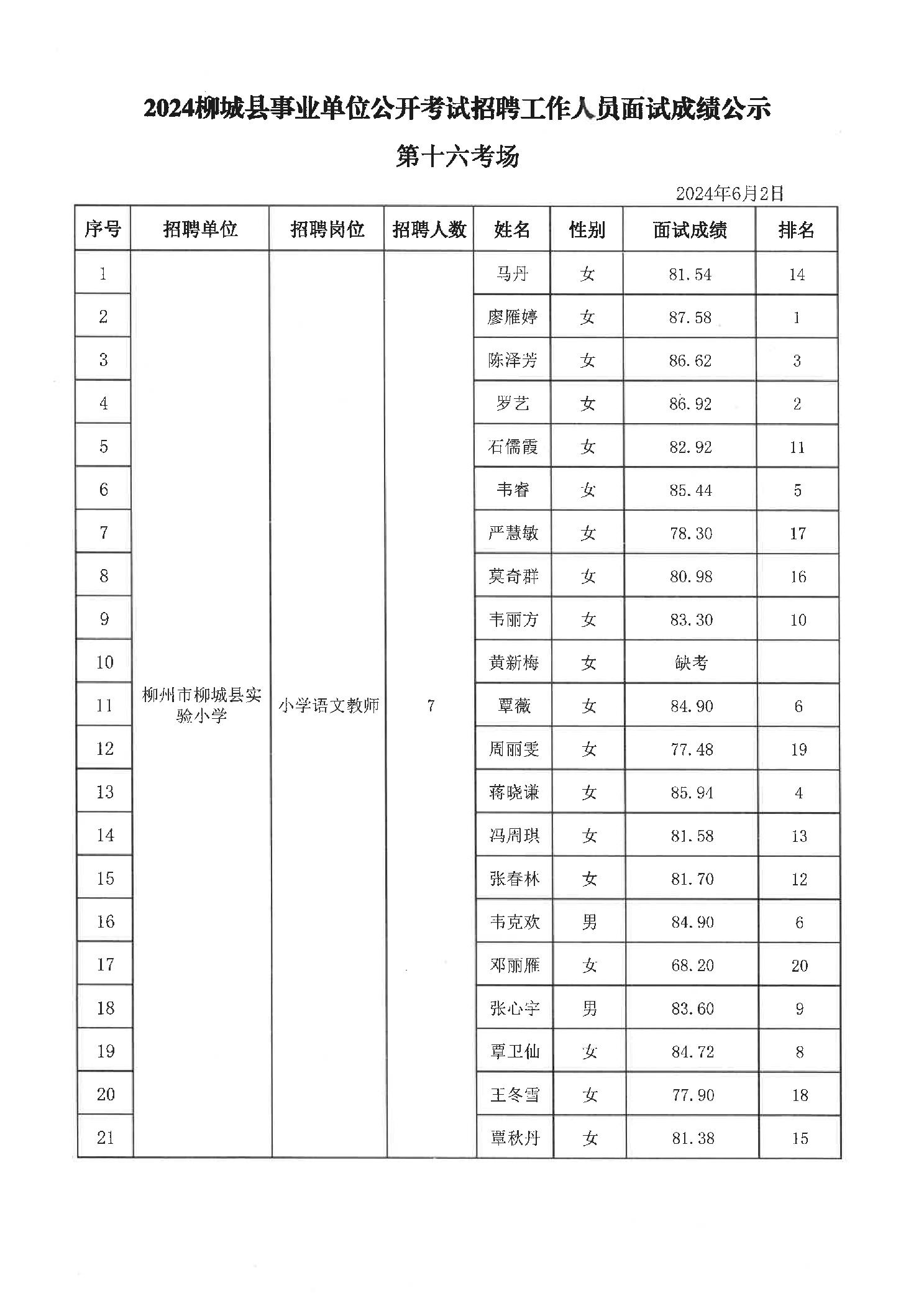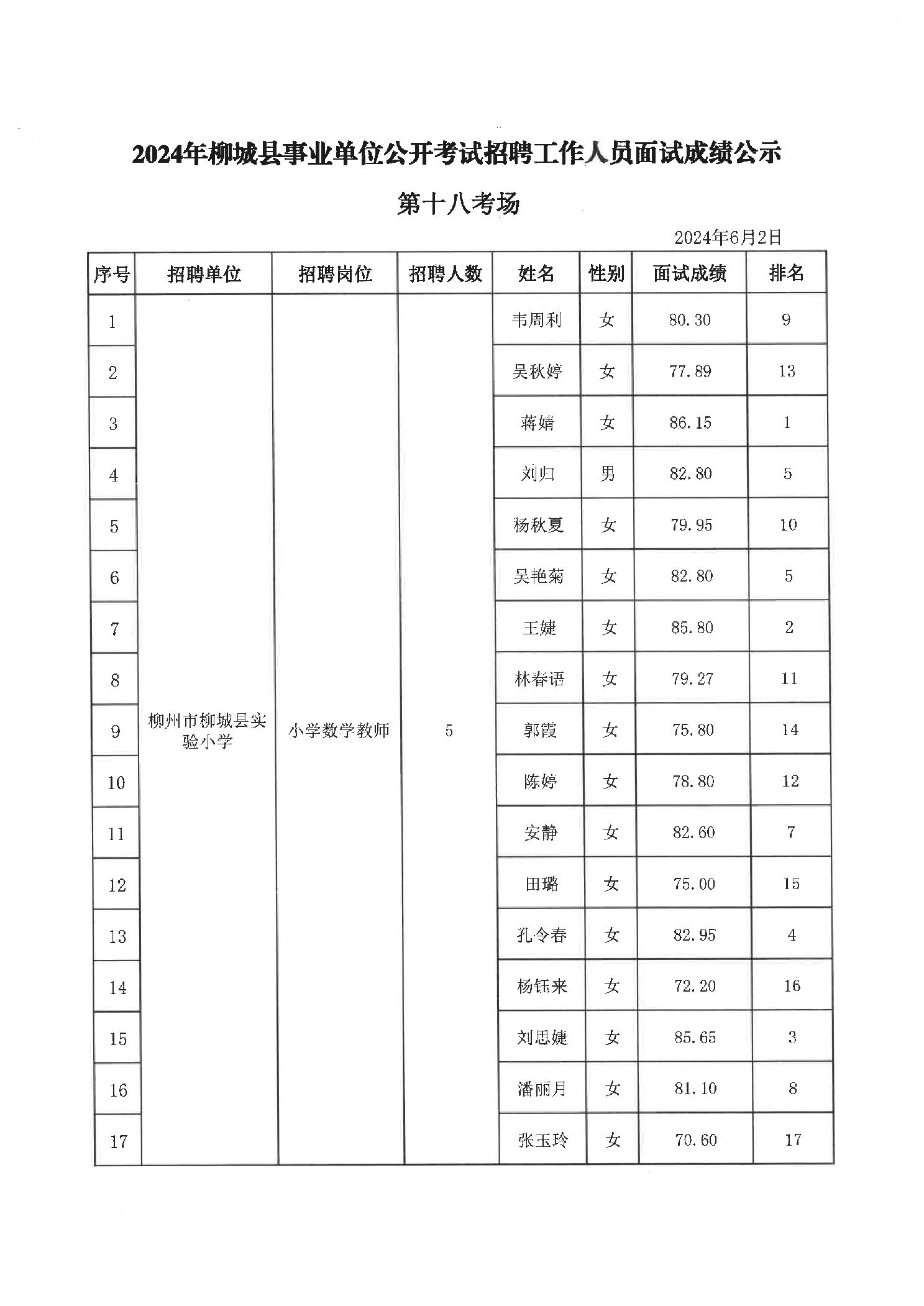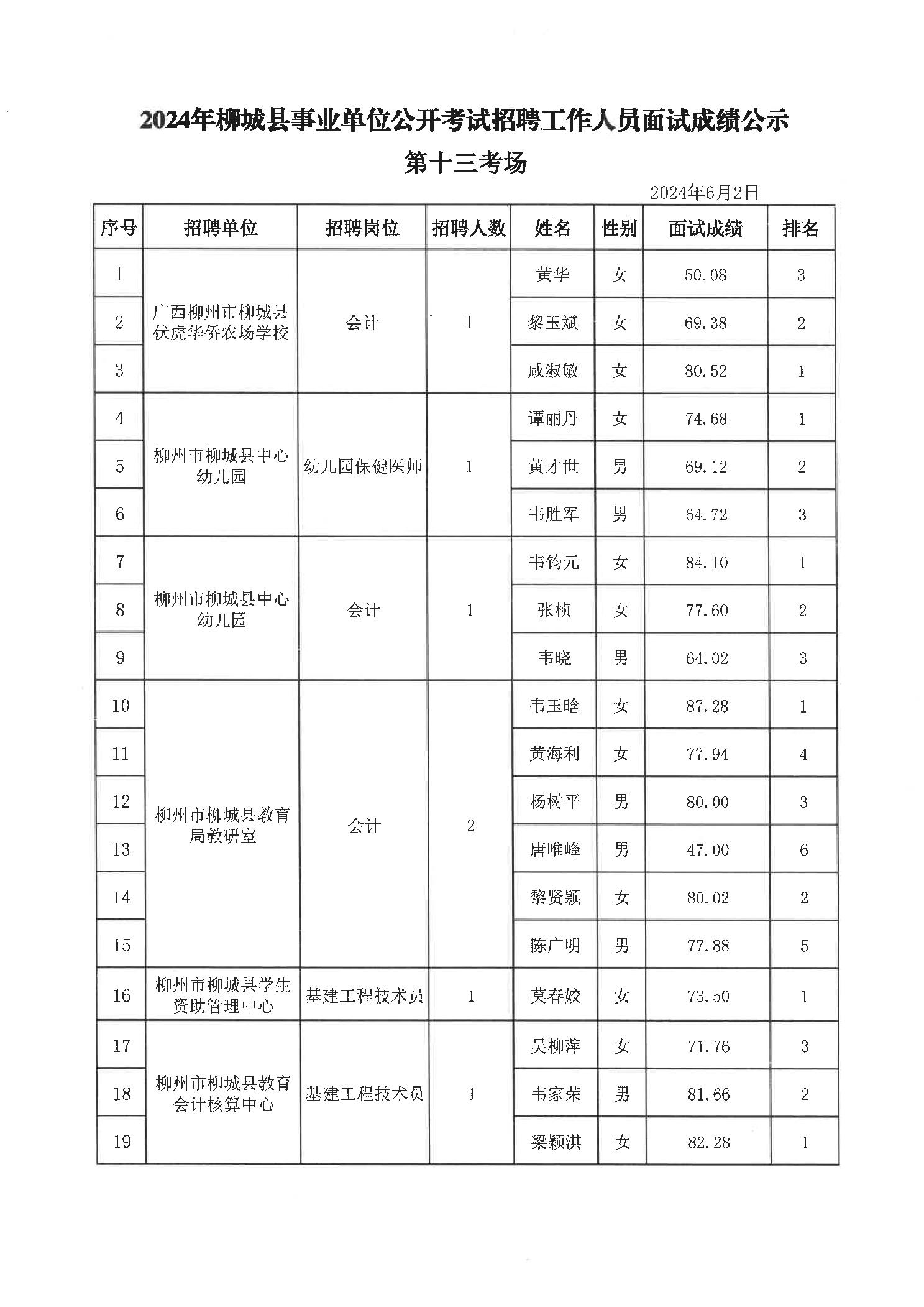 2024年柳城縣事業單位公開考試招聘工作人員面試成績公示