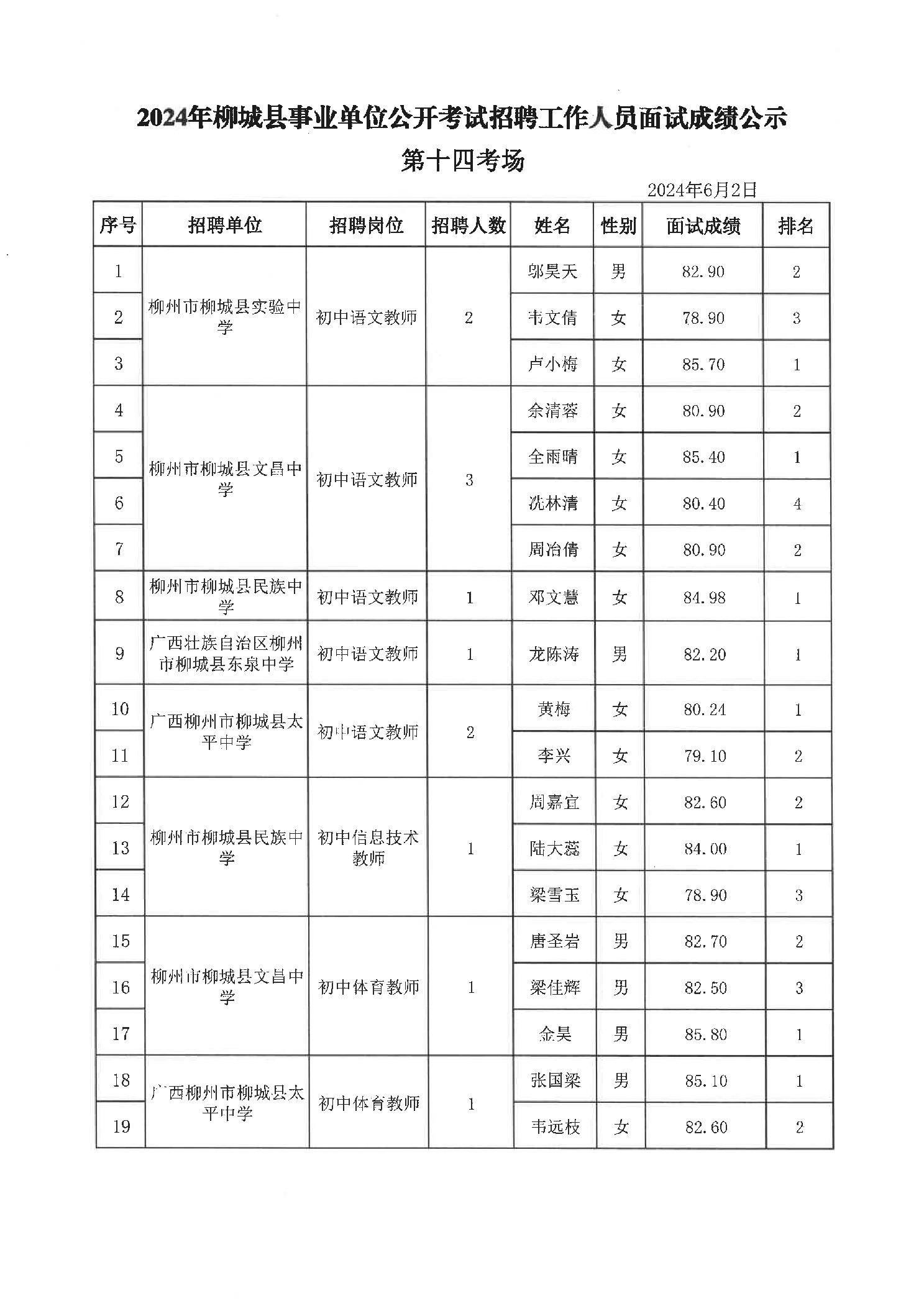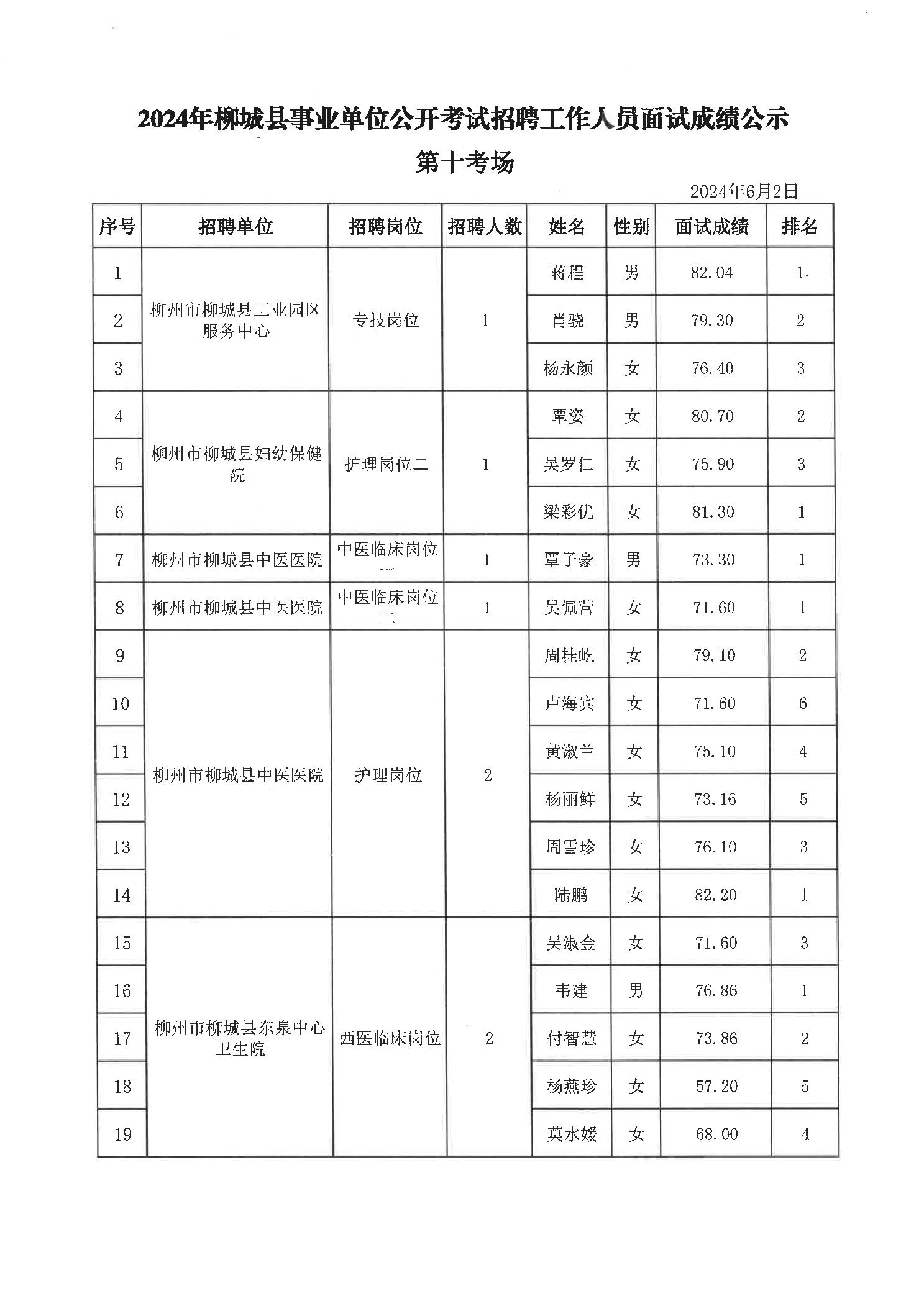 原文標題:2024年柳州市事業單位公開考試招聘工作人員面試成績公示(柳城縣崗位)