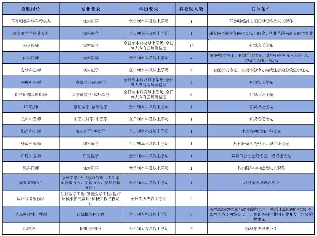 招聘對象:1、應屆畢業生;2、規培生;3、已取得執業資格的在崗人員