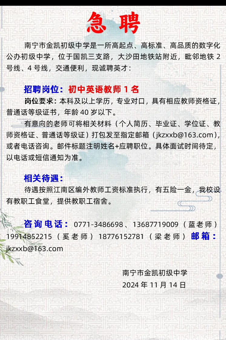 2024年南寧市金凱初級中學招聘英語教師1人
