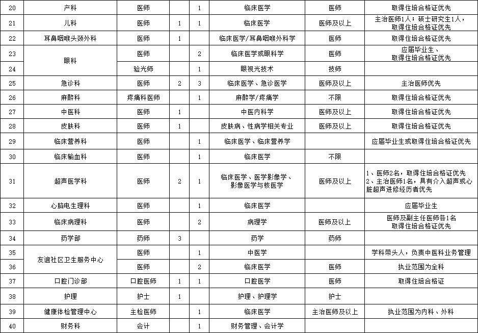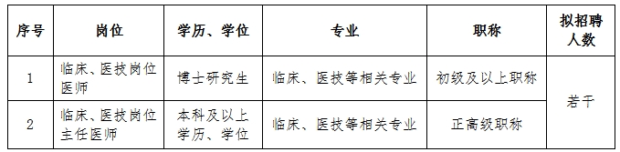 (二)臨床、醫技、護理等崗位人才(緊缺急需專業:重癥醫學科、全科醫學科、康復醫學科、感染性疾病科、急診科、兒科、麻醉科、眼科、皮膚科、病理科、心腦電生理科等科室醫師)