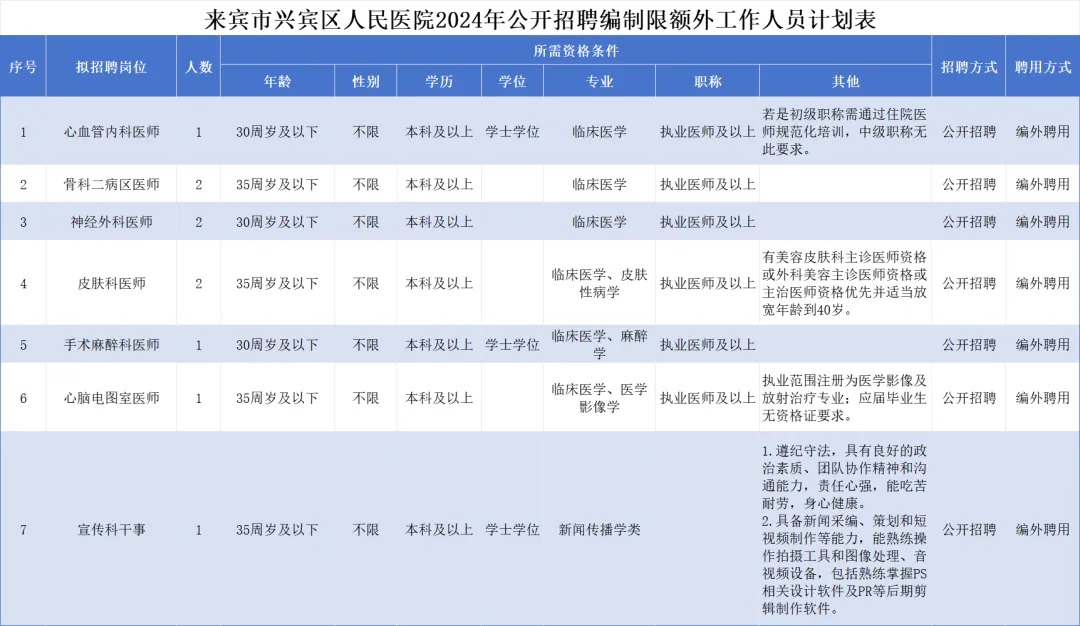 附件1:來賓市興賓區人民醫院2024年公開招聘編制限額外工作人員計劃表.xlsx