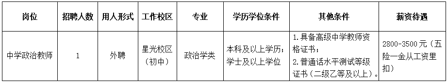 南寧市第十中學創立于1958年,是廣西壯族自治區示范性普通高中,南寧市普通高中常規管理優秀學校。學校黨委堅守立德樹人的根本任務,堅持以教書育人為本的教育理念,為黨育人、為國育才,引領十中全體師生,戮力同心,奮楫篤行。學校實行黨組織領導的校長負責制,經過60多年的艱苦奮斗,教育教學質量穩步上升,先后獲“自治區文明校園”“自治區衛生學校”“南寧市先進基層黨組織”“南寧市依法治校示范校”“南寧市‘十三五’教育科研先進單位”“南寧市高中畢業班工作卓越獎”“特長生培養優秀獎”等榮譽,并連續多年獲得“南寧市高中畢業班工作優秀獎”。學校校園環境優美、教學設施齊全、辦學理念先進、辦學質量蒸蒸日上,既具有豐厚的文化歷史底蘊、又充滿青春活力。學校總占地193.4畝,目前有兩個校區。其中星光校區為初中部,地處南寧市江南區星光大道西二里10號,占地面積21417平方米;上津校區為高中部,地處南寧市江南區上津路26號,占地面積86843.64平方米,是全寄宿制高中。學校擁有高配置的理化生實驗室、多媒體教室、移動教室、錄播教室、心理輔導室、舞蹈室、室內體育館、標準運動場,學校圖書館的藏書量達12萬冊。上津校區實現了“智慧校園”全覆蓋,學生的考勤、圖書借閱、就餐等校園生活全部實現了一卡通智慧管理。優越的學習環境為懷揣夢想的十中學子搭建了高起點、高標準的學習平臺。在“養正毓德,璞玉生輝”辦學理念和“潤石成玉”學校文化主題的引領下,學校以“提升初中,辦強高中”為辦學目標,恪守“勇于超越,成就自我”的校訓,以“潤毓品德高尚,勇于追求夢想,擁有家鄉情懷的如玉君子”作為育人目標,進一步凸顯學校的五大特色(“潤實”黨建特色、“潤心”管理特色、“一班一品”德育特色、“信•實”課堂特色、“潤玉”課程特色),全面抓實學校科學化、精細化、人文化管理。先進的辦學理念、特色化的辦學路徑為學校今后實現宏圖大志注入了強勁的動力。根據學校工作需要,南寧市第十中學星光校區(初中部)面向社會招聘教職工,具體崗位如下: