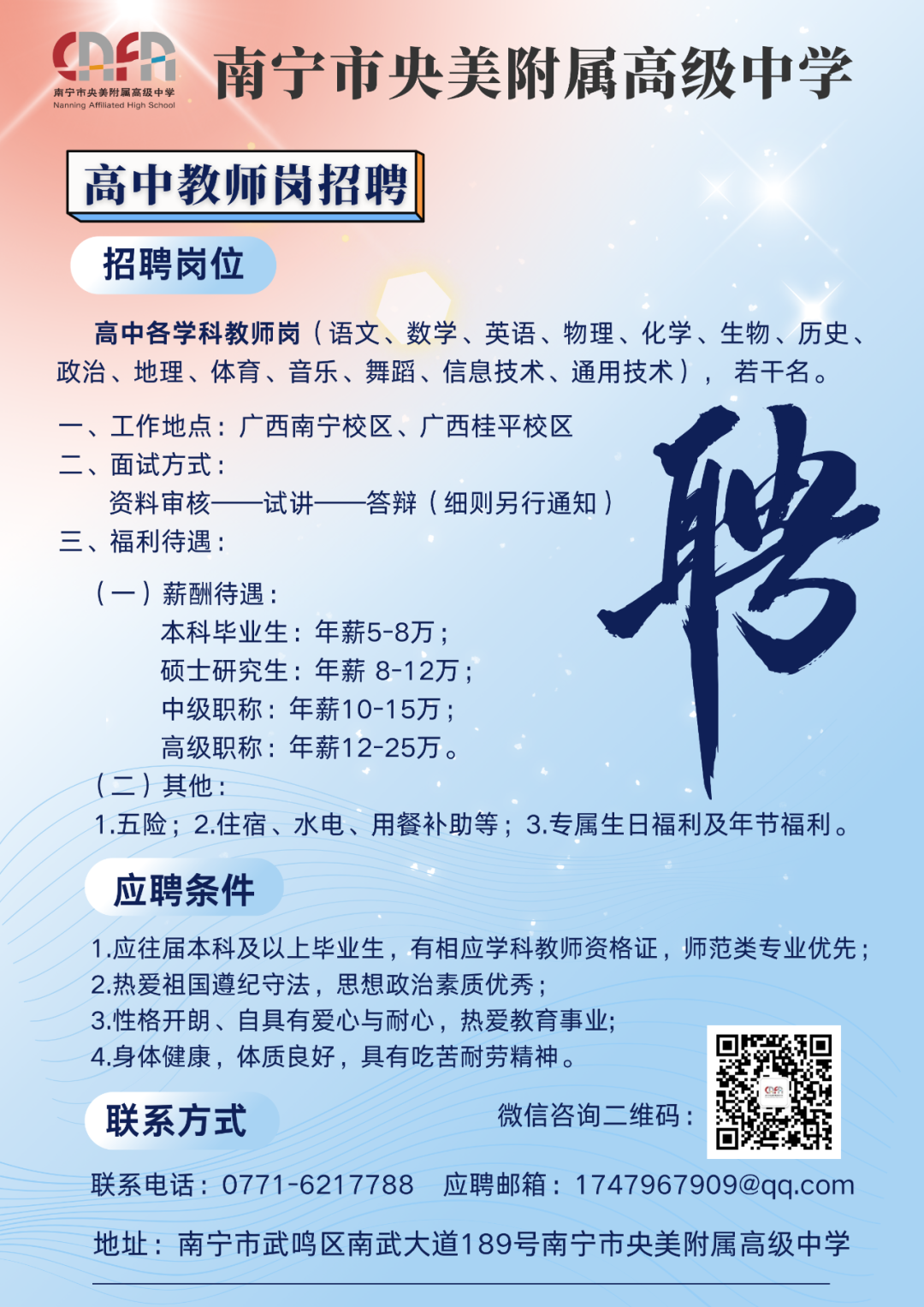 原文標題:南寧市央美附屬高級中學2025春季學期高中教師招聘