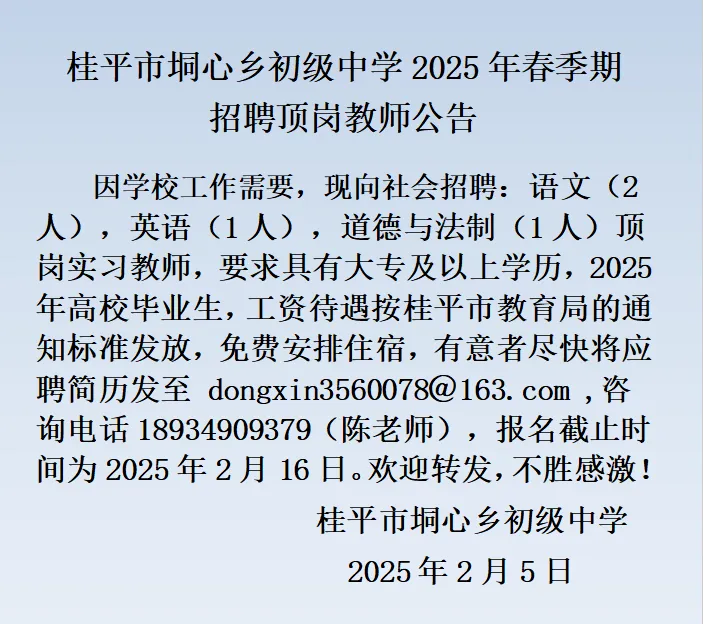 2025年春季學(xué)期貴港桂平市垌心鄉(xiāng)初級中學(xué)招聘頂崗教師公告
