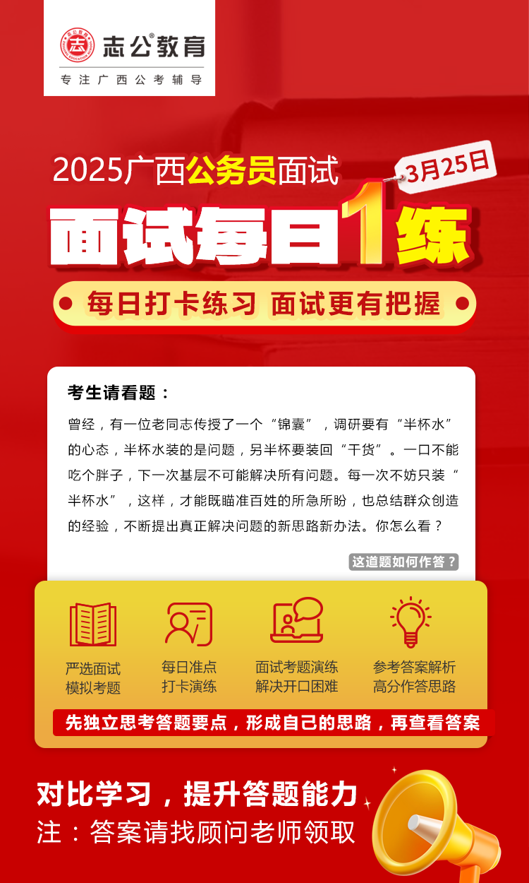 廣西區考面試準備需緊扣本土特色,強化邏輯表達和實務能力,同時注重細節(如資格復審材料、禮儀)。建議從現在起每天練習2-3套題,持續積累廣西熱點案例,爭取面試高分!資料已經為大家準備好了,快去看看吧!