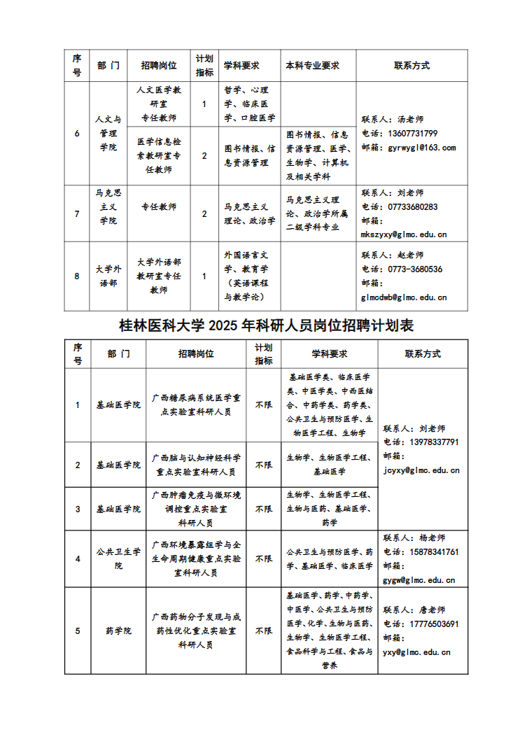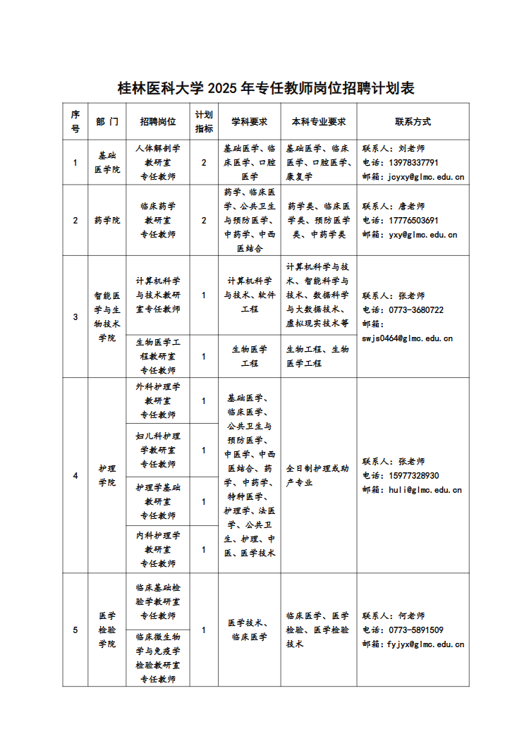 (二)各部門聯系方式見:桂林醫科大學各崗位招聘計劃表。