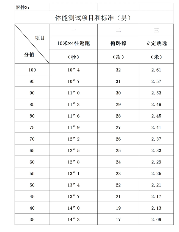 3.體能測試。參照人民警察招錄標準執行(具體項目和標準詳見附件2)。測試項目:10米×4往返跑、立定跳遠、俯臥撐,體能測試三項全部達標的,方為合格。