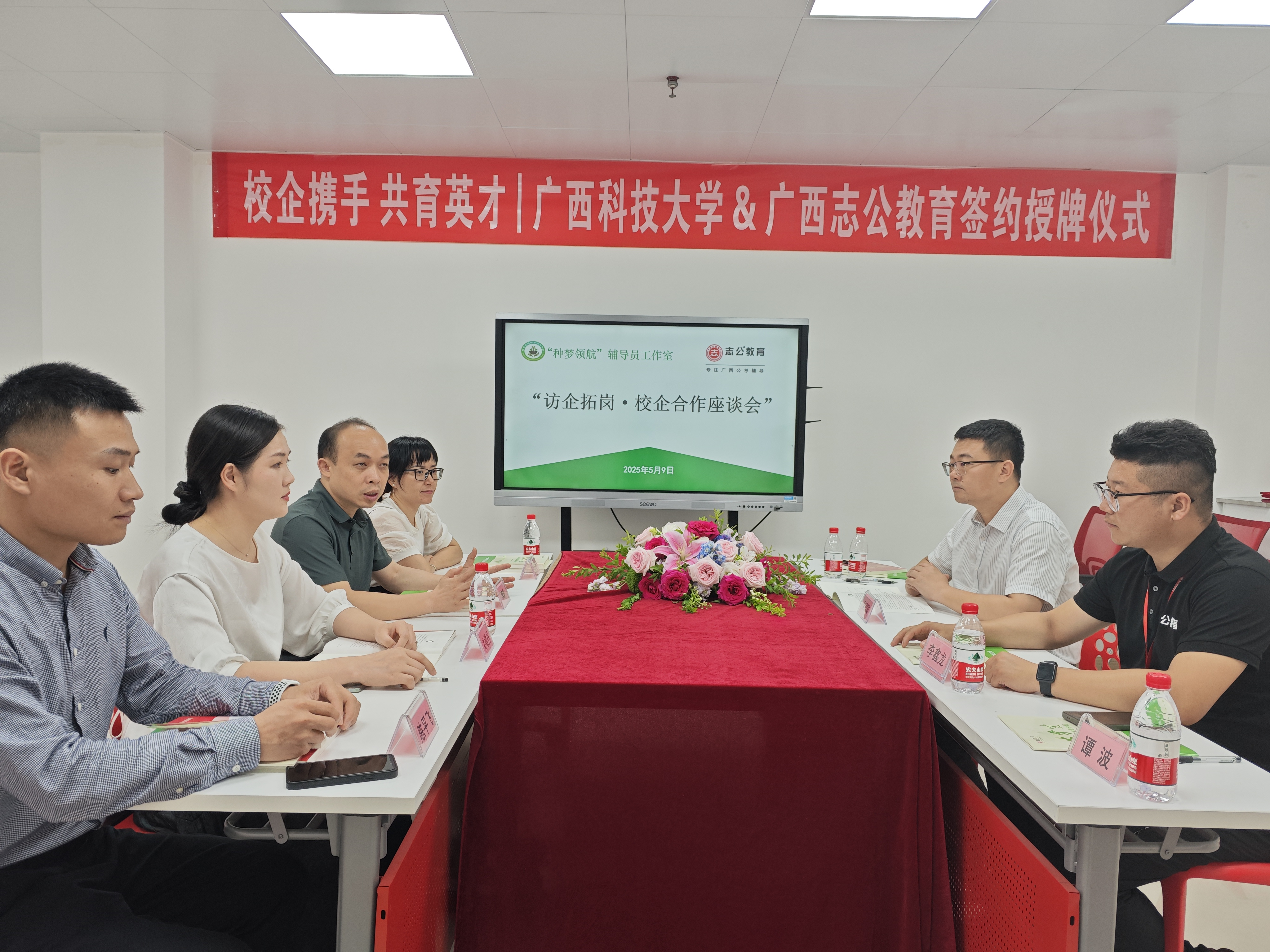 2025年5月9日,志公教育柳州分校與廣西科技大學(xué)外國(guó)語學(xué)院在深入交流與友好協(xié)商的基礎(chǔ)上,于廣西科技大學(xué)成功舉行戰(zhàn)略合作簽約儀式。此次活動(dòng)由志公教育CBG總經(jīng)理吳冠敏先生帶隊(duì),廣西科技大學(xué)外國(guó)語學(xué)院黨委書記李輝、廣西科技大學(xué)"種夢(mèng)領(lǐng)航"工作室負(fù)責(zé)人張林微及師生代表共同參與,標(biāo)志著雙方在產(chǎn)教融合、人才培養(yǎng)及大學(xué)生就業(yè)創(chuàng)業(yè)領(lǐng)域的合作邁入新階段。