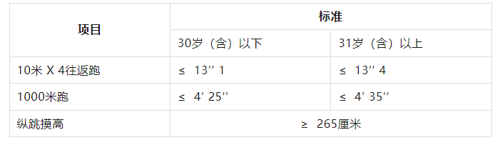 報考人員須參加全部三項體能測評。參加者凡有其中一項不達標或放棄,視為體能測評不合格。體能測評合格,方可進入下一環節。