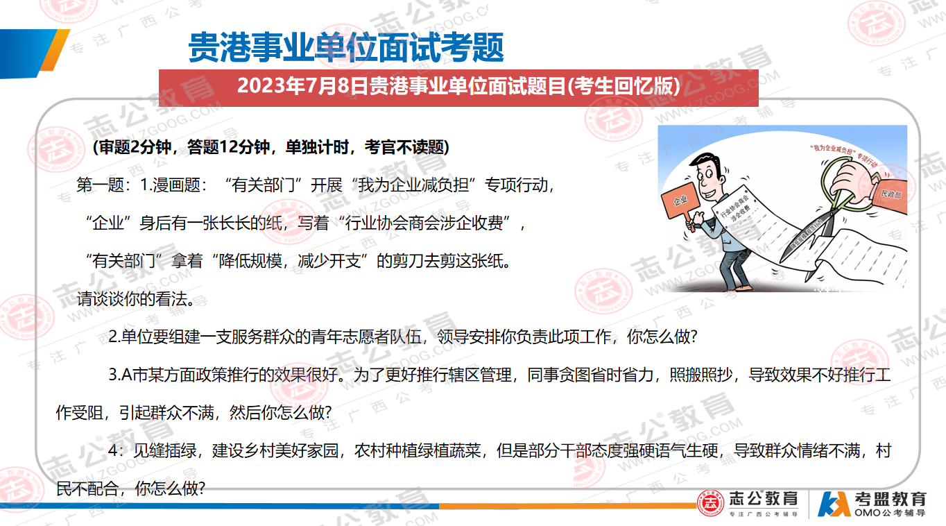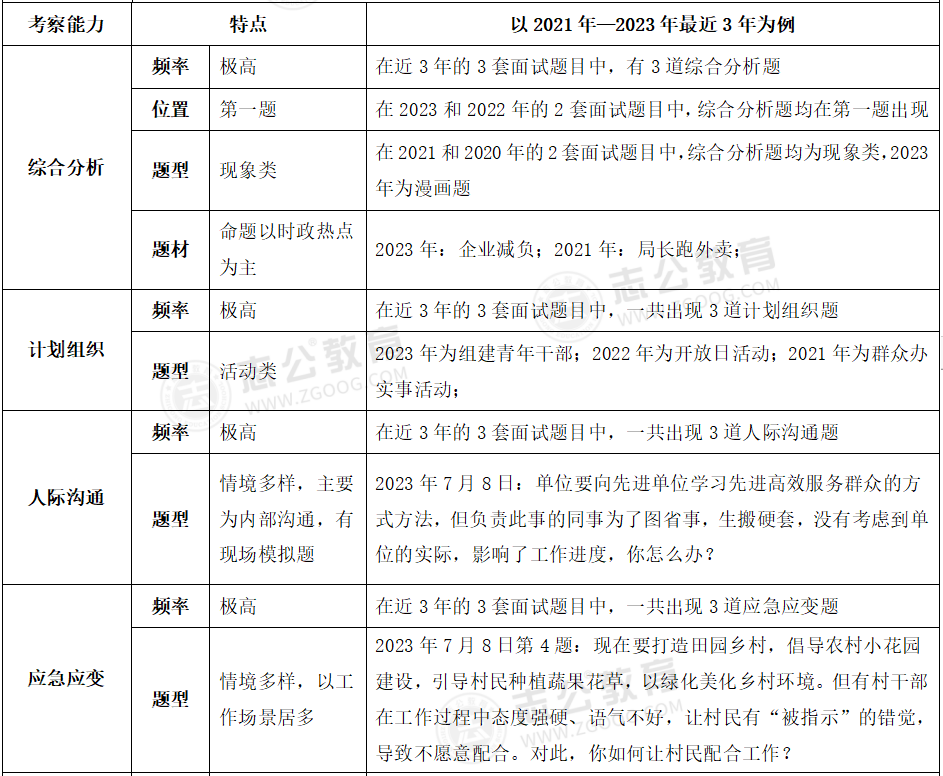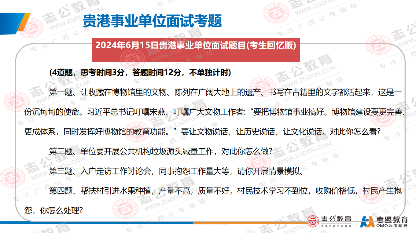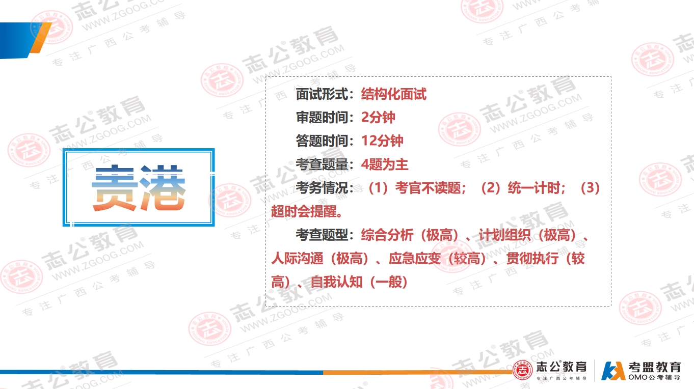 貴港事業單位面試主要采用結構化面試形式;審題時間:2分鐘;答題時間:12分鐘;考查題量:4題為主??紕涨闆r:考官不讀題、統一計時、超時會提醒??疾轭}型:綜合分析(極高)、計劃組織(極高)、人際溝通(極高)、應急應變(較高)、貫徹執行(較高)、自我認知(一般)。