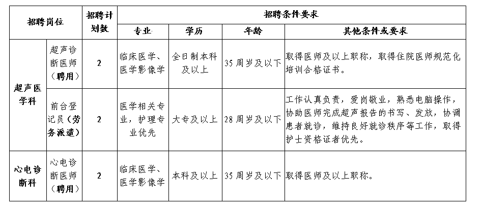 根據醫院業務發展需要,特面向社會緊急招聘超聲醫學科、心電診斷科工作人員。現將招聘有關事項公告如下: