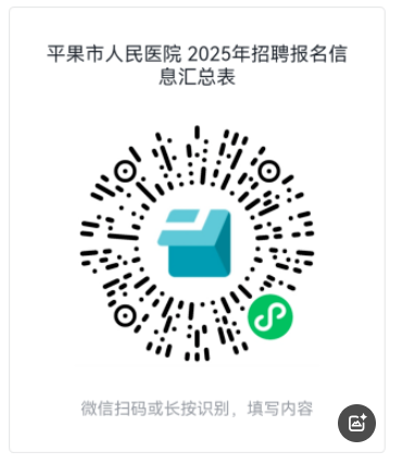 1.填寫提交紙質版《平果市人民醫院2025年度公開招聘專業技術人員報名表》(附件3),并掃描下方二維碼填寫報名信息。