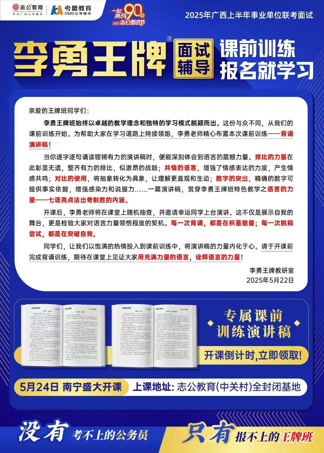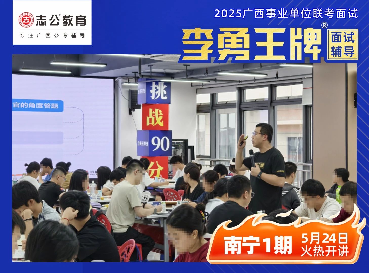 繼志公教育&李勇王牌®班教研室5月17日發(fā)布修改招生規(guī)則的通知后,各位未來“橘”長們,翹首以盼的時(shí)刻終于來啦!5月24日,志公教育李勇王牌®班——改革后的首個(gè)開班,在南寧火熱啟幕!現(xiàn)場學(xué)習(xí)氣氛爆棚,李勇老師與學(xué)員高頻互動(dòng),學(xué)員們直呼 “學(xué)到停不下來”!這不僅是一場面試特訓(xùn),更是一次思維與能力的雙重蛻變!