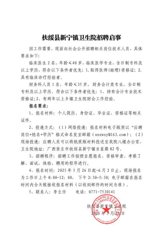 2025年廣西崇左扶綏縣新寧鎮衛生院招聘3人