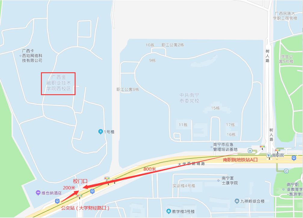 學校位于南寧市西鄉(xiāng)塘區(qū)大學西路168號,可乘坐公交車103路、807路大學財經路口下,或乘坐地鐵1號線到“南職院”站A口出站(如圖所示)。