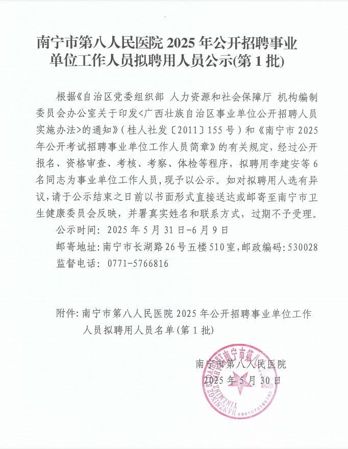 南寧市第八人民醫院2025年公開招聘事業單位工作人員擬聘用人員公示(第1批)