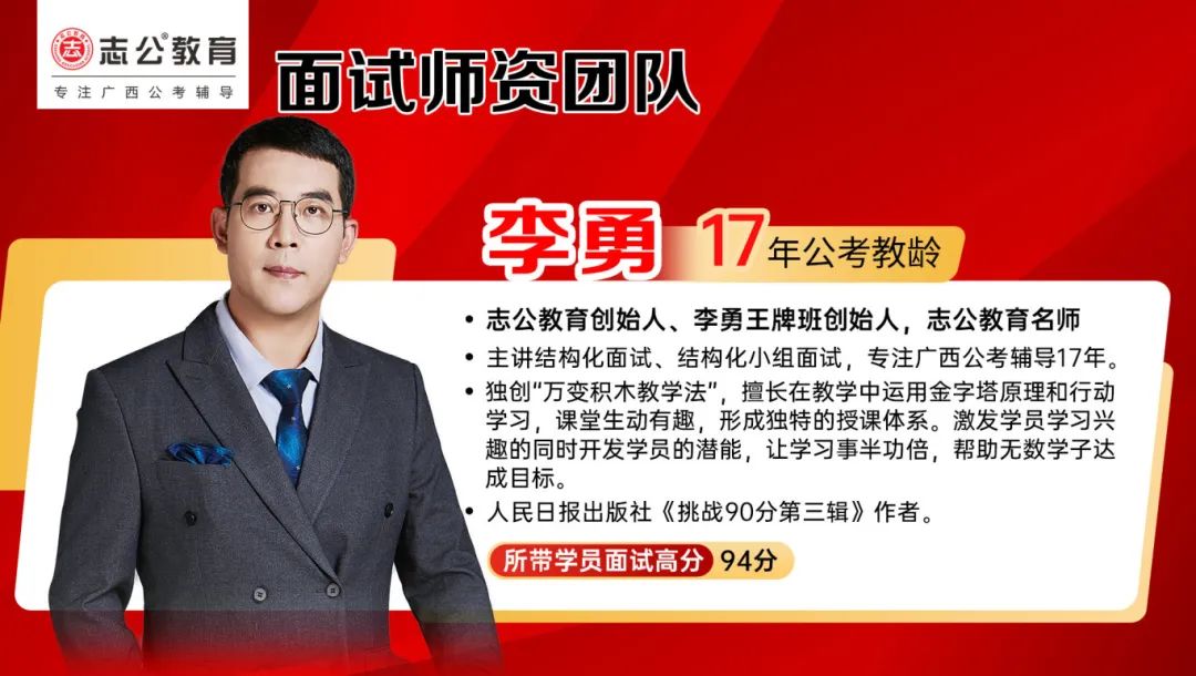 李勇——志公教育創始人、李勇王牌®班創始人,志公教育名師。主講結構化面試、結構化小組面試,專注廣西公考輔導17年。獨創“萬變積木教學法”,擅長在教學中運用金字塔原理和行動學習,課堂生動有趣,形成獨特的授課體系。激發學員學習興趣的同時開發學員的潛能,讓學習事半功倍,幫助無數學子達成目標。同時也是人民日報出版社《挑戰90分第三輯》作者。