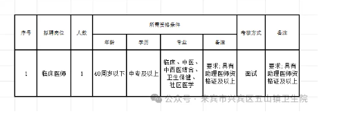 原文標題:來賓市興賓區五山鎮衛生院公開招聘編制外聘用人員公告