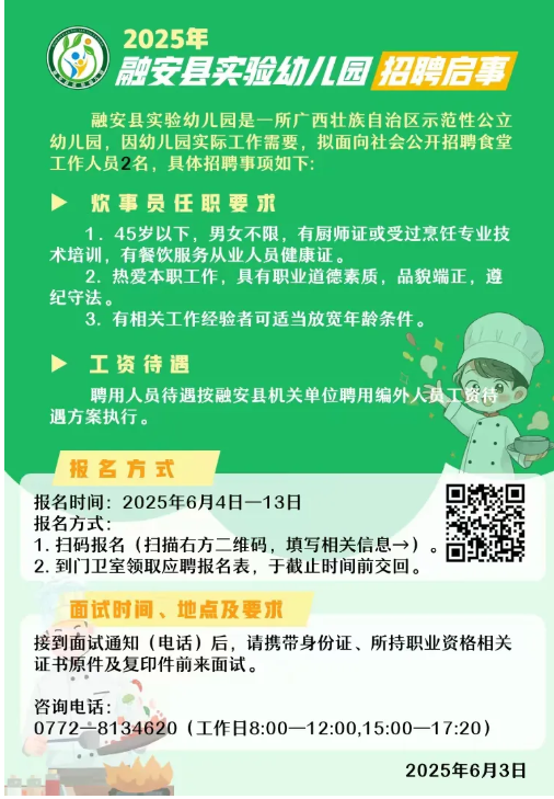 2025年柳州融安縣實驗幼兒園炊事員招聘2人