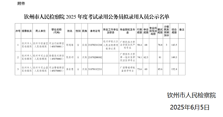 附件:欽州市人民檢察院2025年度考試錄用公務員擬錄用人員公示名單