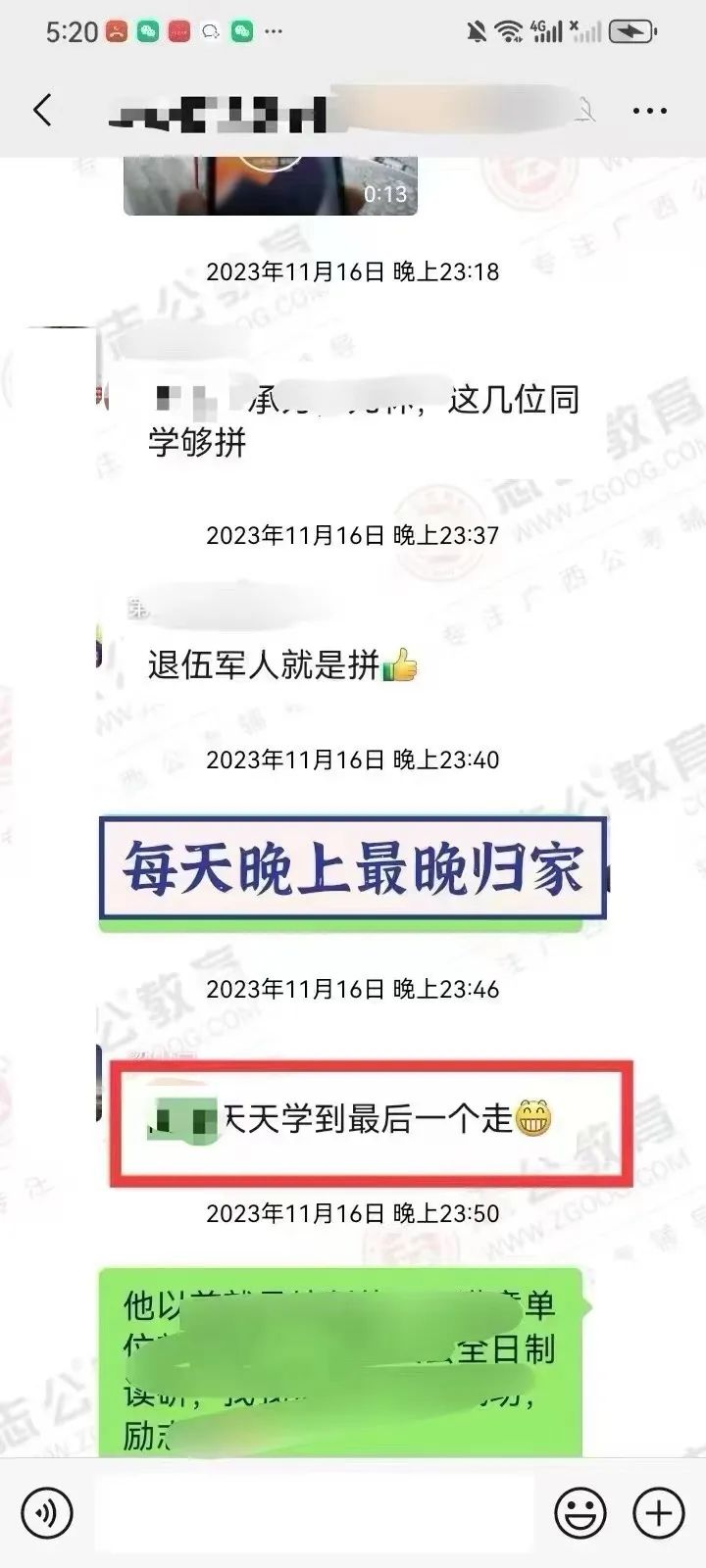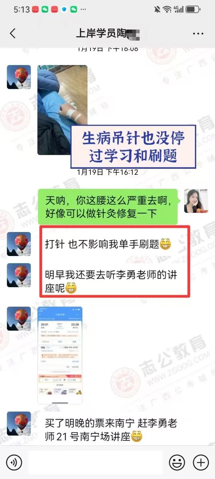在備考的日子里,無數(shù)個夜晚,我看到他朋友圈發(fā)的經(jīng)常學(xué)習(xí)練習(xí)到教室關(guān)門最后一個才回家,無數(shù)次往返南寧和桂林兩座城市,只為家庭和研究生學(xué)業(yè)和公務(wù)員備考的有序進行,讓我印象最深的一次,就是他微信拍了一張正在打針輸液的照片發(fā)給我,還打趣的跟我說:還好不影響我單手刷題! 即使學(xué)員因為身體過于勞累導(dǎo)致生病在吊針,也絲毫沒有懈怠過學(xué)習(xí),讓我非常的佩服和感動。