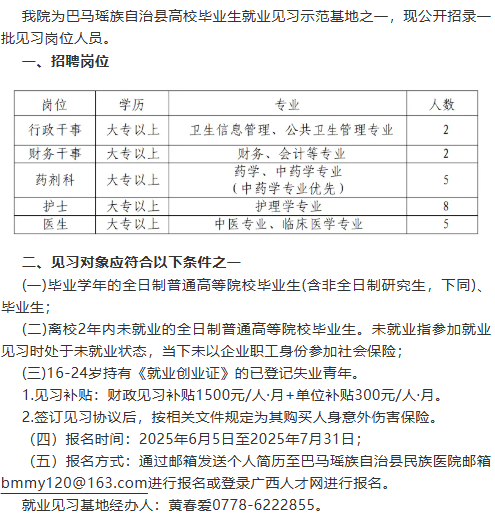 原文標題:巴馬瑤族自治縣民族醫院2025年見習崗位招聘公告