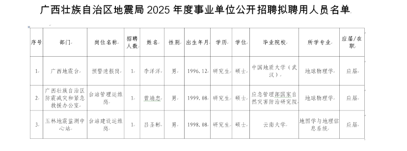 廣西壯族自治區地震局2025年度事業單位公開招聘擬聘用人員公示