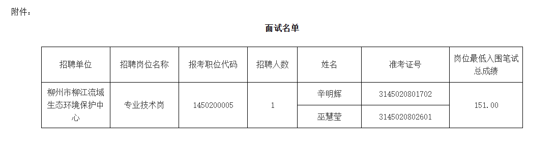 (三)成績公布:面試成績將于面試結束后當天在柳州市生態環境局一樓公示欄進行公示,并同步發布于柳州市生態環境局網站(http://sthjj.liuzhou.gov.cn),請考生自行查看。