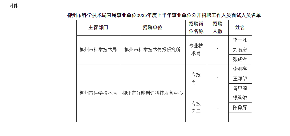 附件:柳州市科學技術局直屬事業單位2025年度上半年事業單位公開招聘工作人員面試人員名單