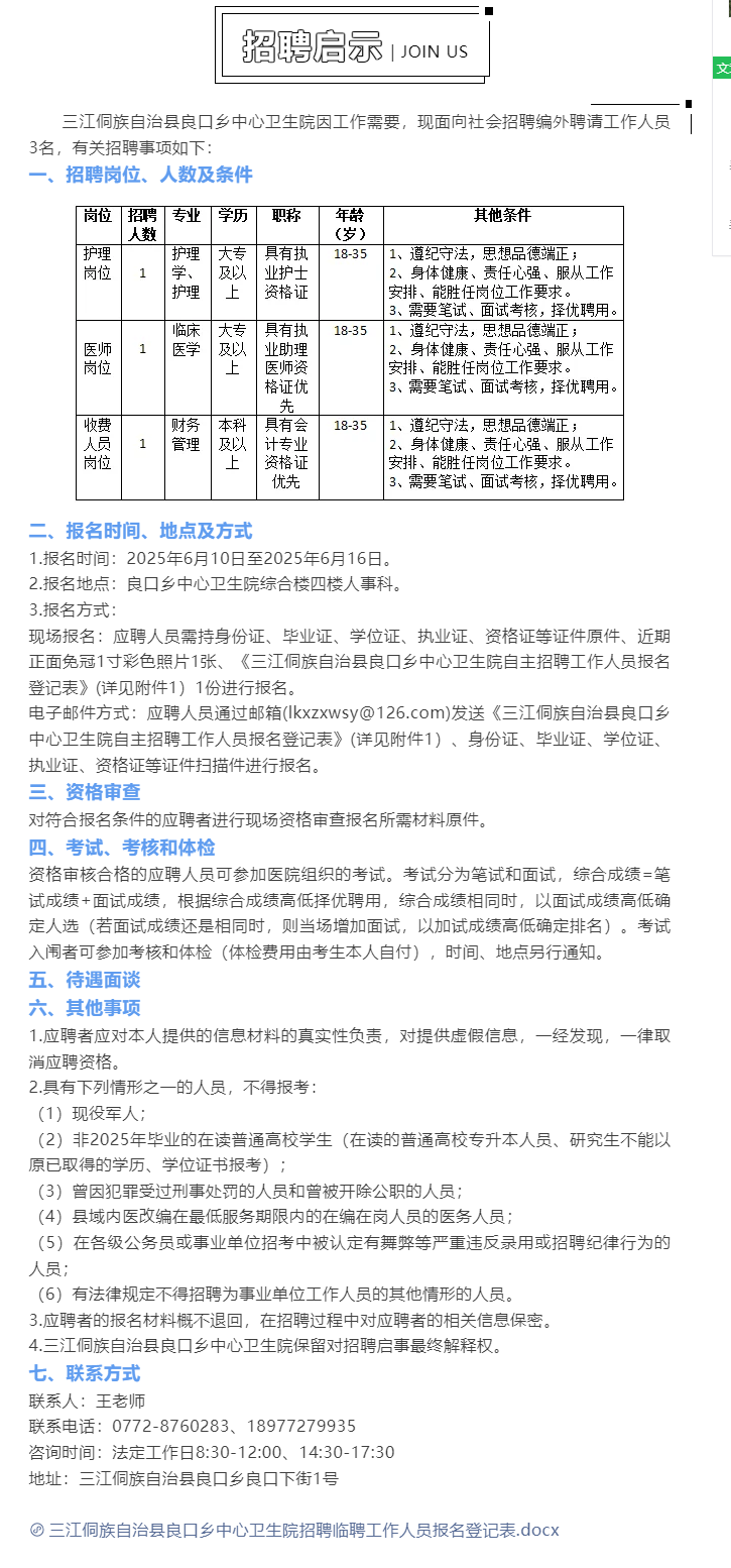 三江侗族自治縣良口鄉中心衛生院招聘3人