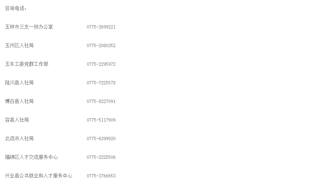 具體事宜可進入廣西高校畢業生“三支一扶”服務網(http://szyf.gxrc.com)查詢政策或向玉林市“三支一扶”辦公室電話咨詢。