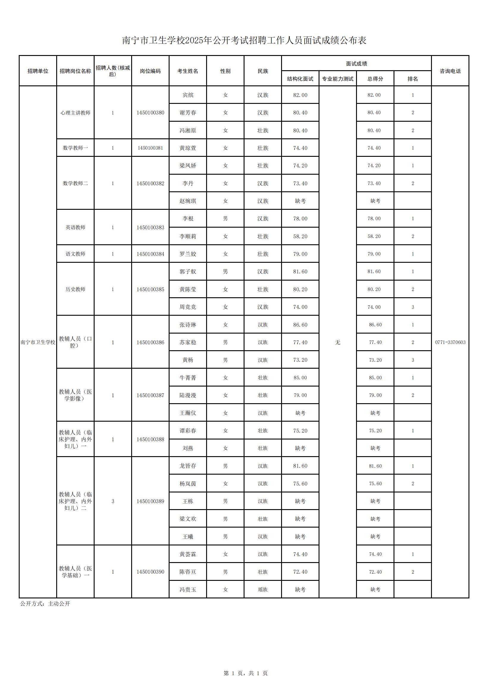 原文標題:南寧市衛生學校2025年公開考試招聘工作人員面試成績公布表