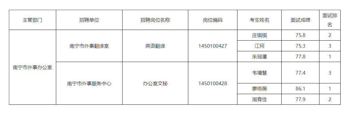 南寧市外事辦公室2025年公開考試招聘事業單位工作人員面試成績表