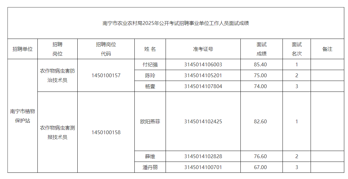 原文標題:南寧市農業農村局2025年公開考試招聘事業單位工作人員面試成績