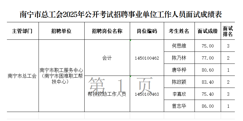原文標題:南寧市總工會2025年公開考試招聘事業單位工作人員面試成績表