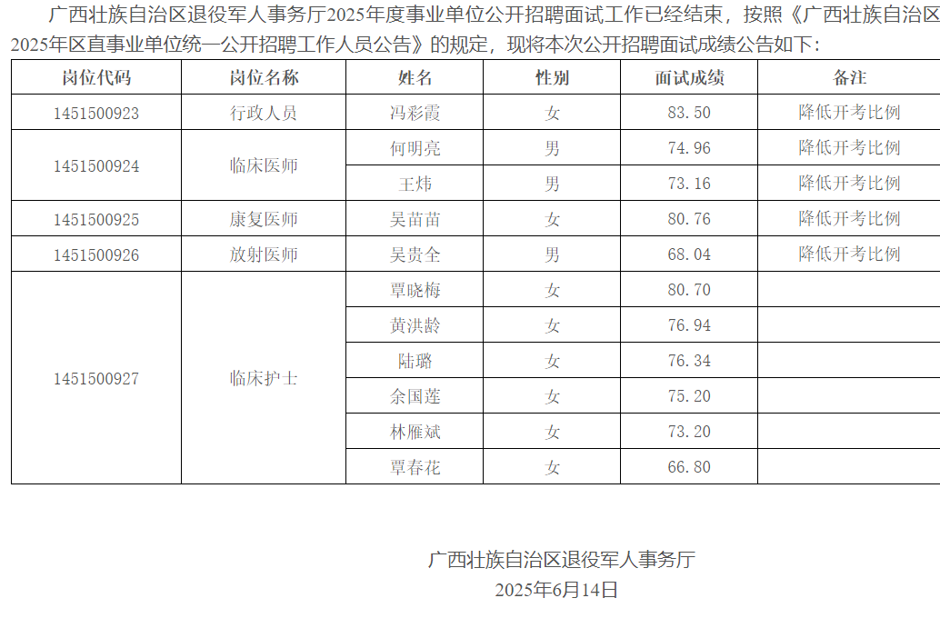廣西壯族自治區退役軍人事務廳關于發布2025年度事業單位公開招聘面試成績的公告