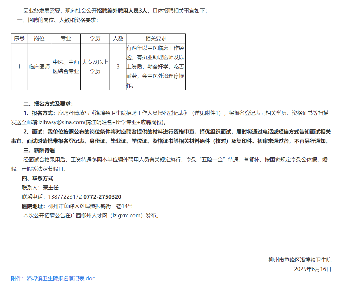 柳州市魚峰區洛埠鎮衛生院招聘3人