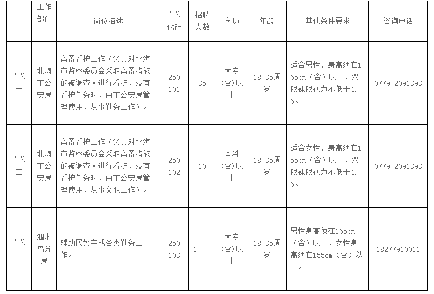 有關招聘信息,應聘人員可登錄北海市人才網(wǎng)(www.bhrc.cn)、北海市公安局微信公眾號“北海公安”查詢。咨詢報考崗位、資格條件等信息,可在工作時間內(nèi)致電各崗位咨詢電話。
