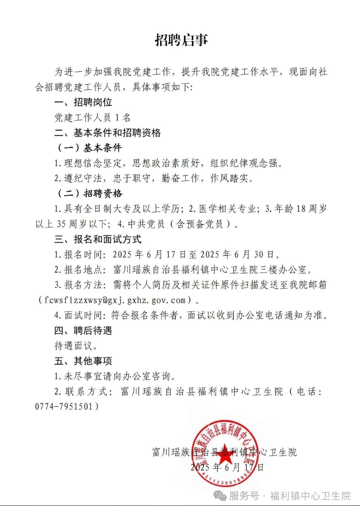 原文標題:福利鎮中心衛生院招聘1名黨建工作人員