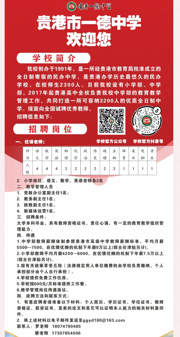 原文標題:貴港市一德中學招聘簡章