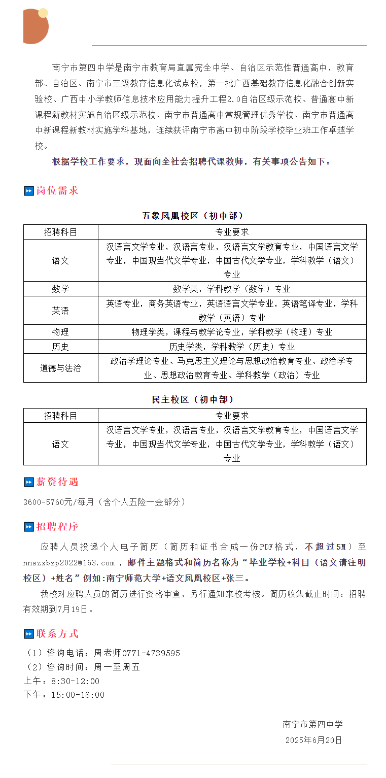 2025年南寧市第四中學代課教師招聘公告