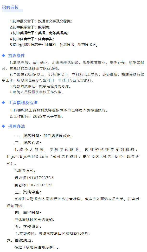 原文標題:防城港市第二中學(豪丫校區)2025年秋季學期臨聘教師招聘公告