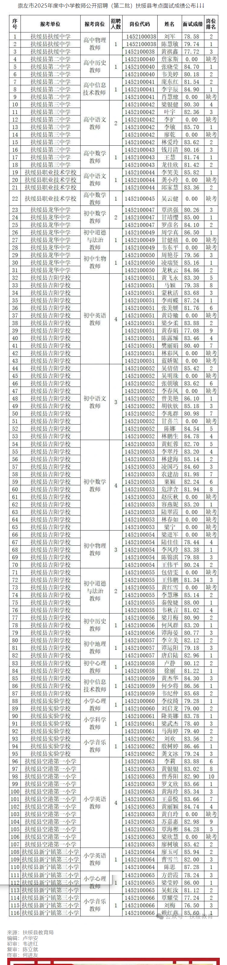 崇左市2025年度中小學教師公開招聘(第二批)扶綏縣考點面試成績公布