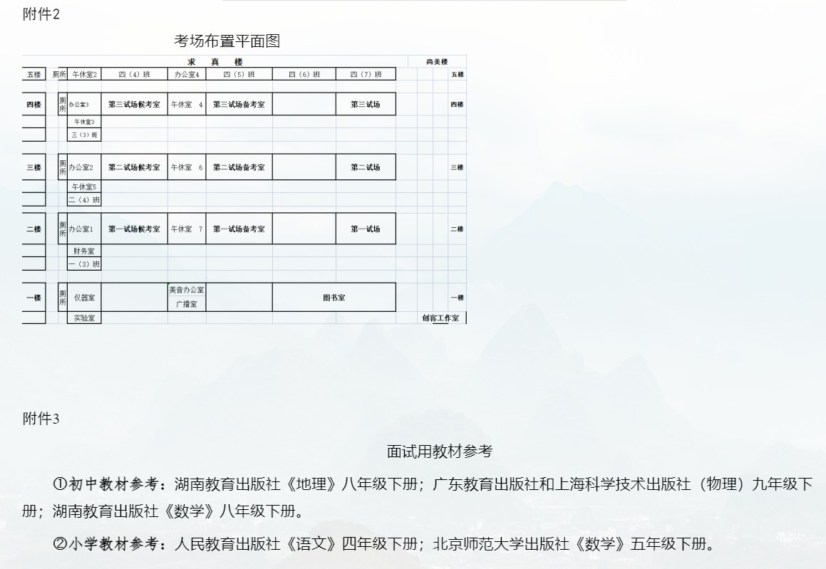 (二)面試內容:面試主要是通過試講考察考生的專業素質和教育教學綜合素質,包括:對教材的分析和把握程度、專業知識能力、教學設計、教學方法、教師素養等。試講教材為我縣相應崗位學校用書,詳見面試用教材參考(附件3)。